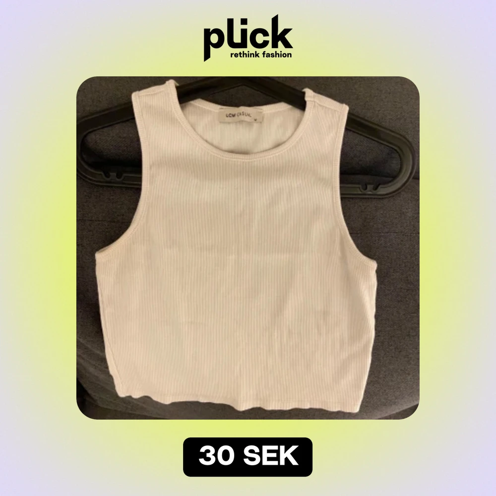 Säljer en stilren vit ribbad linnetopp från LCW Casual. Den är ärmlös och croppad, perfekt för sommardagar eller som ett basplagg i garderoben. Toppen har en enkel och fräsch design som passar till det mesta. Använd nästan 2-3 gånger💕💕💕