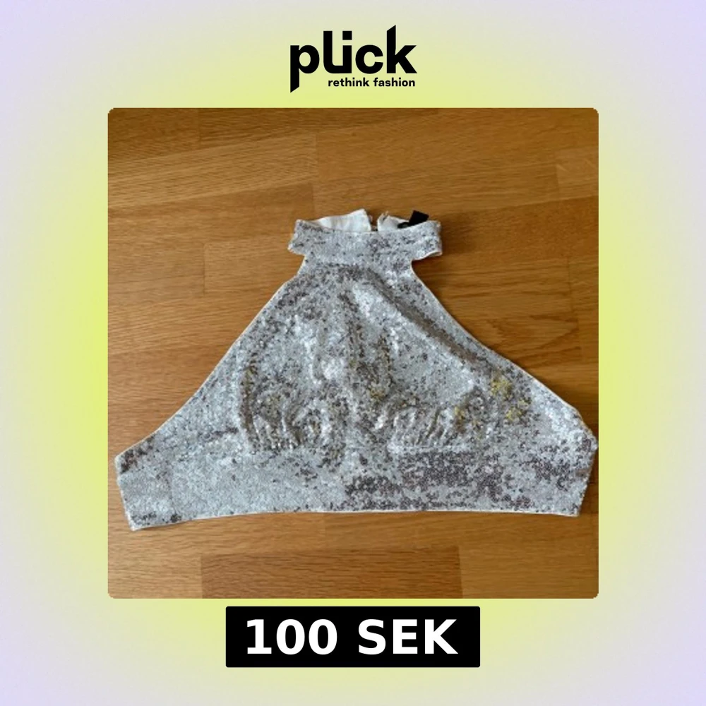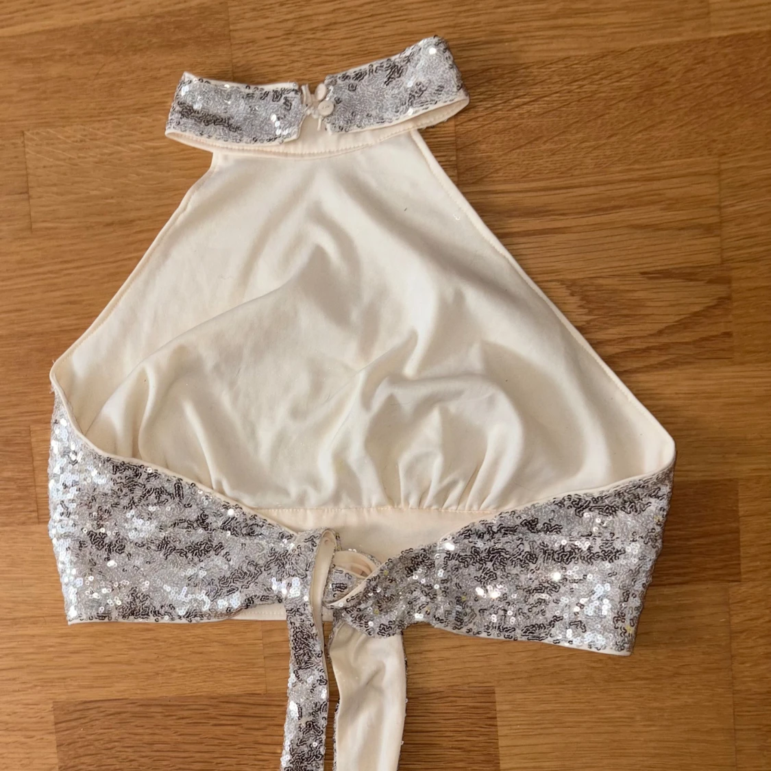Säljer en glittrig halterneck topp i guld med paljetter över hela framsidan. Toppen har hög krage, knäppning i nacken och knytning i ryggen. Perfekt för dig som vill sticka ut och glänsa på festen!