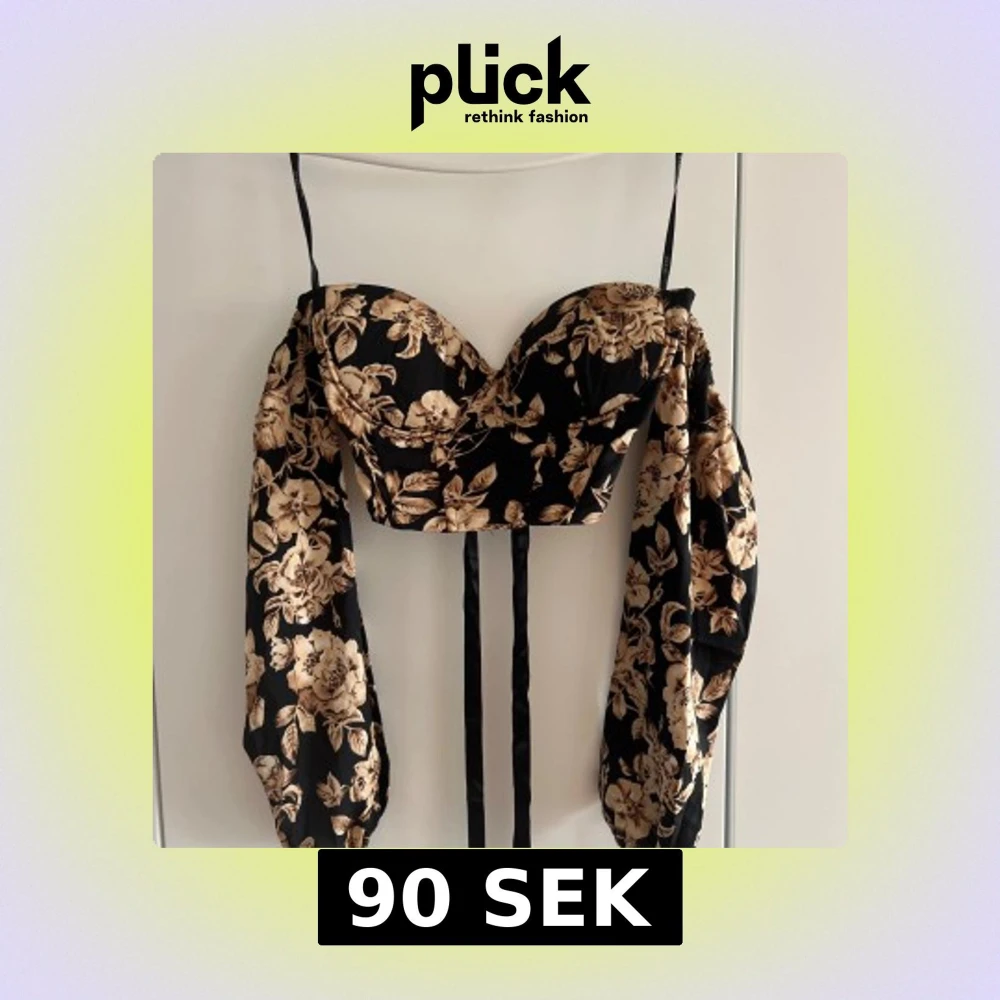 Supersnygg svart korsettopp med beige blommönster och ballongärmar. Toppen har smala axelband, markerad byst och långa band framtill för knyt. Perfekt för dig som vill sticka ut med en trendig och feminin look.