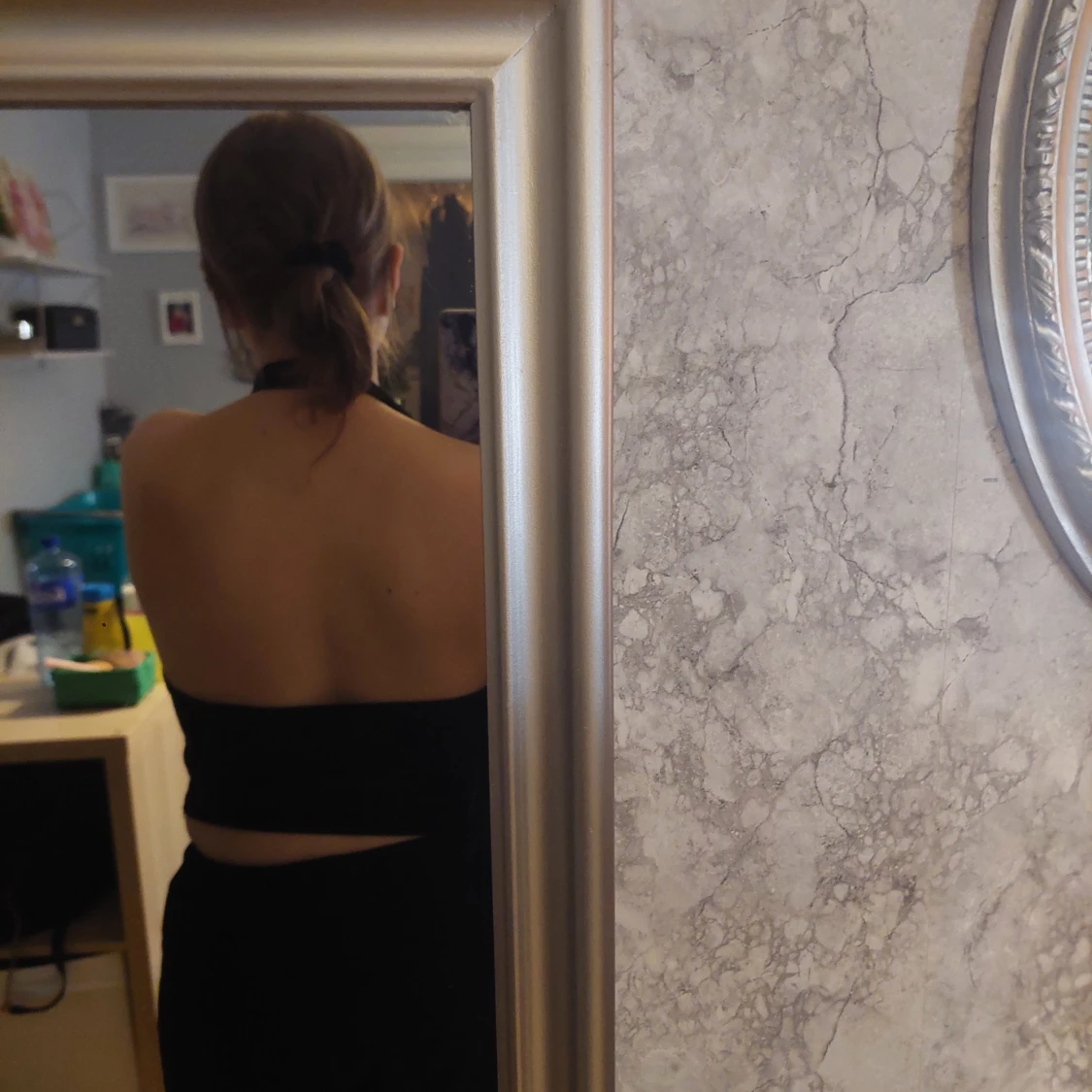 Snygg glittrande topp från H&M i storlek M. Den har en halterneck-design med en ring framtill och en öppen rygg. Perfekt för festliga tillfällen såsom nyår! 🖤