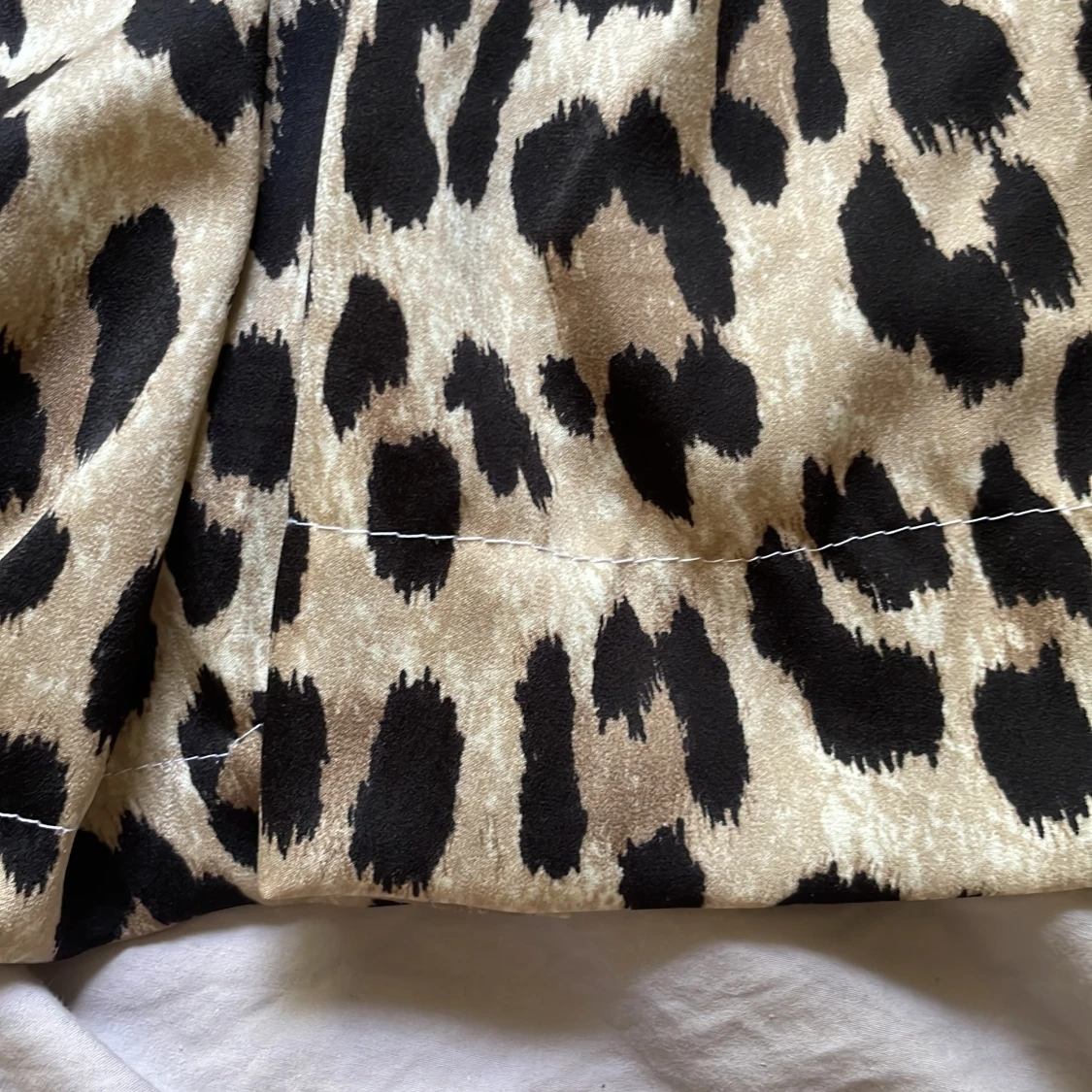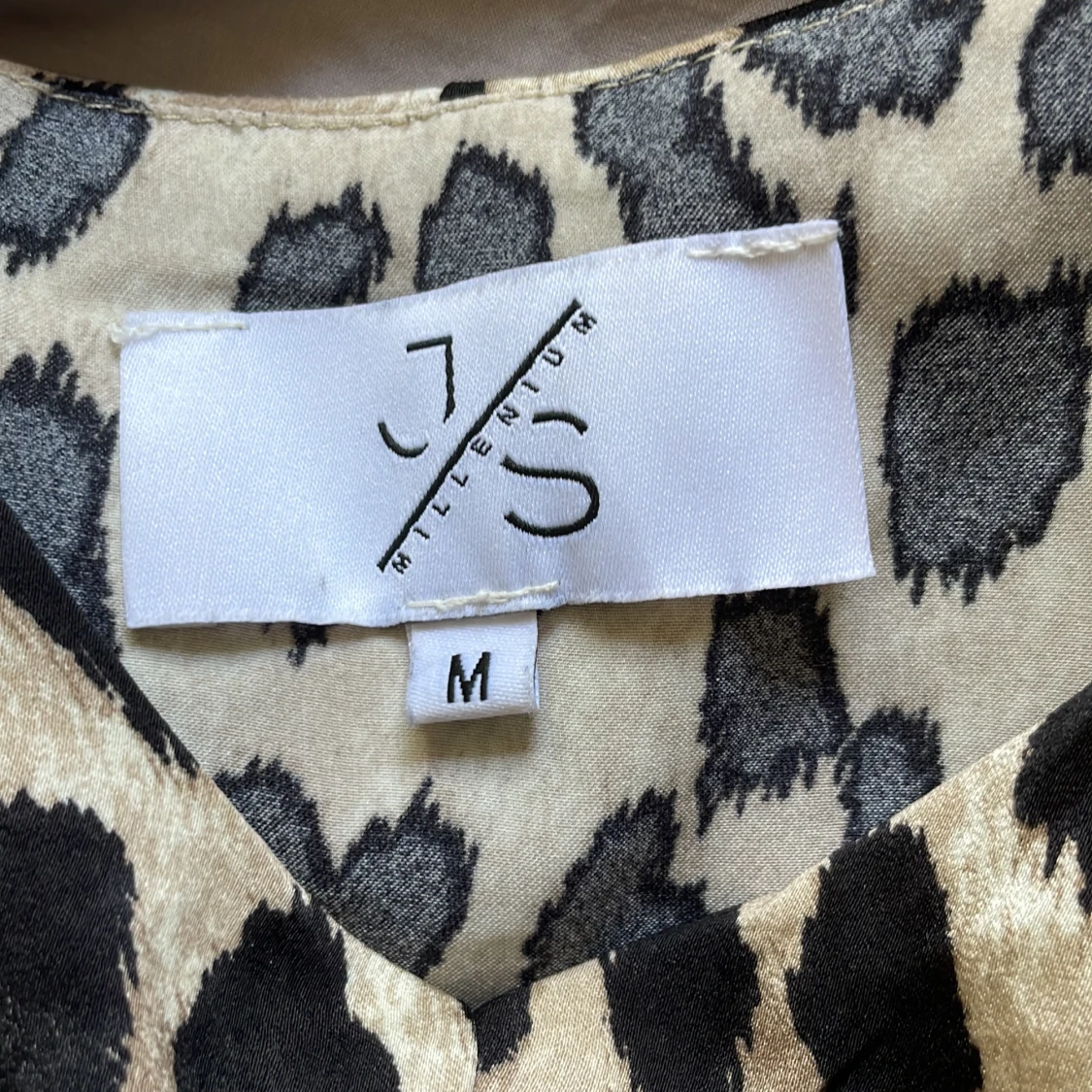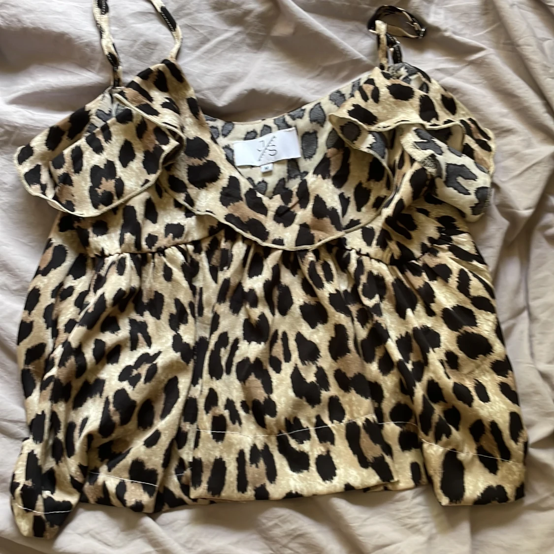 Säljer en snygg linnetopp från JS Millenium i leopardmönster. Toppen har tunna axelband och volangdetaljer längs urringningen. Färgerna går i beige och svart, och materialet känns lätt och svalt – perfekt för varma dagar.