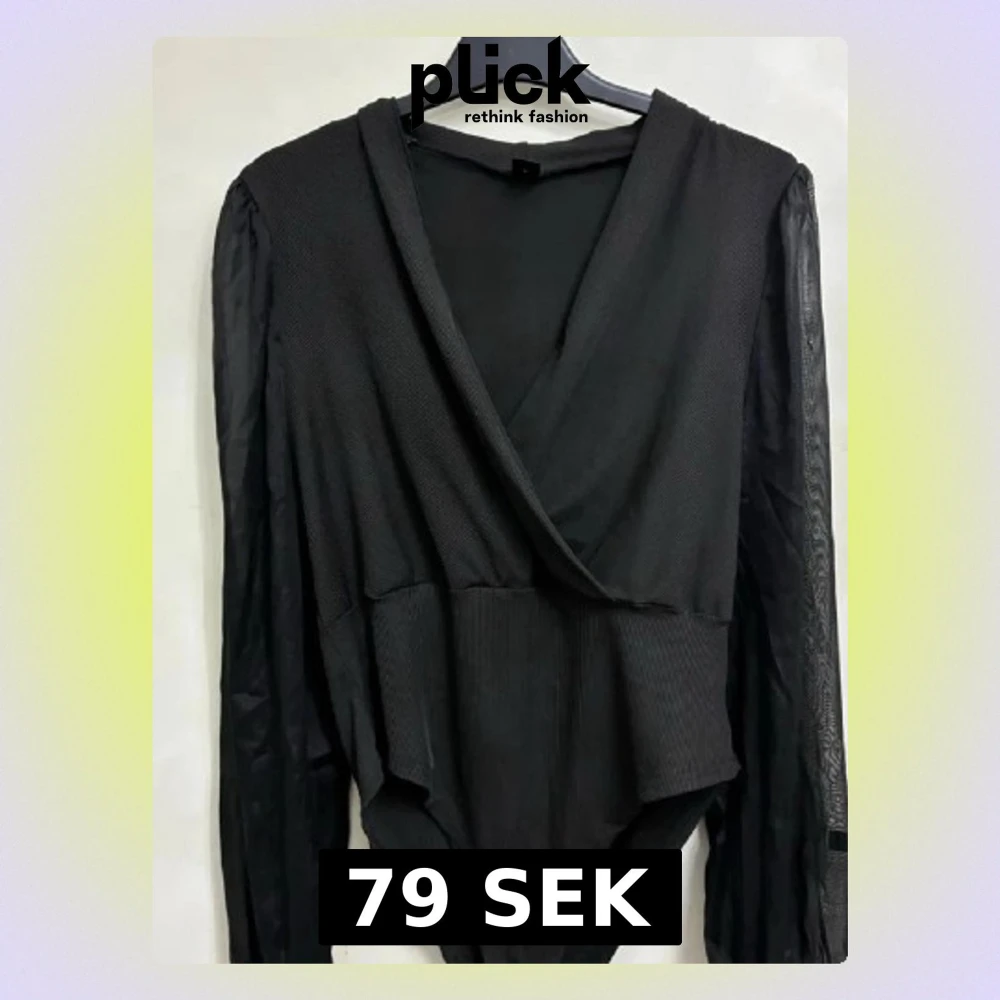 Säljer en svart omlott blus med lång transparent ärm och v-ringad hals. Toppen har en snygg croppad passform och är tillverkad i ett lätt, ribbat material som ger en cool look. Perfekt för dig som gillar stilrena och trendiga plagg.