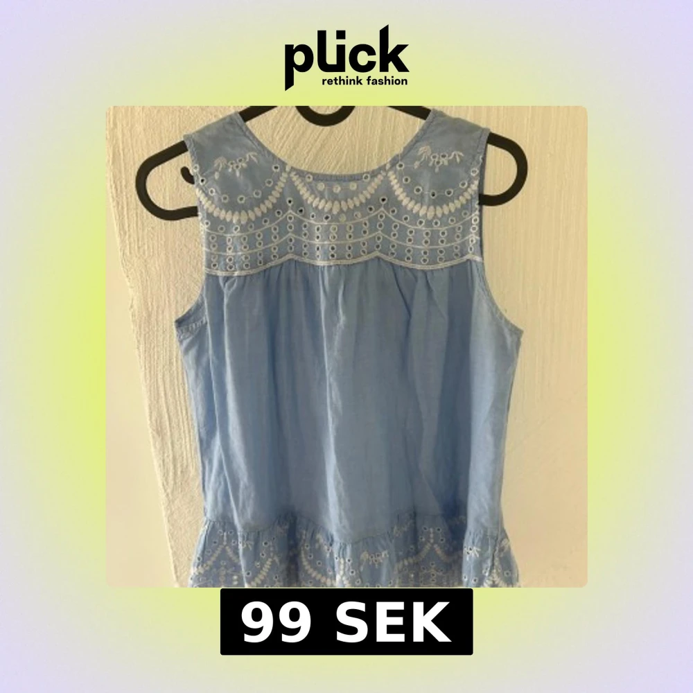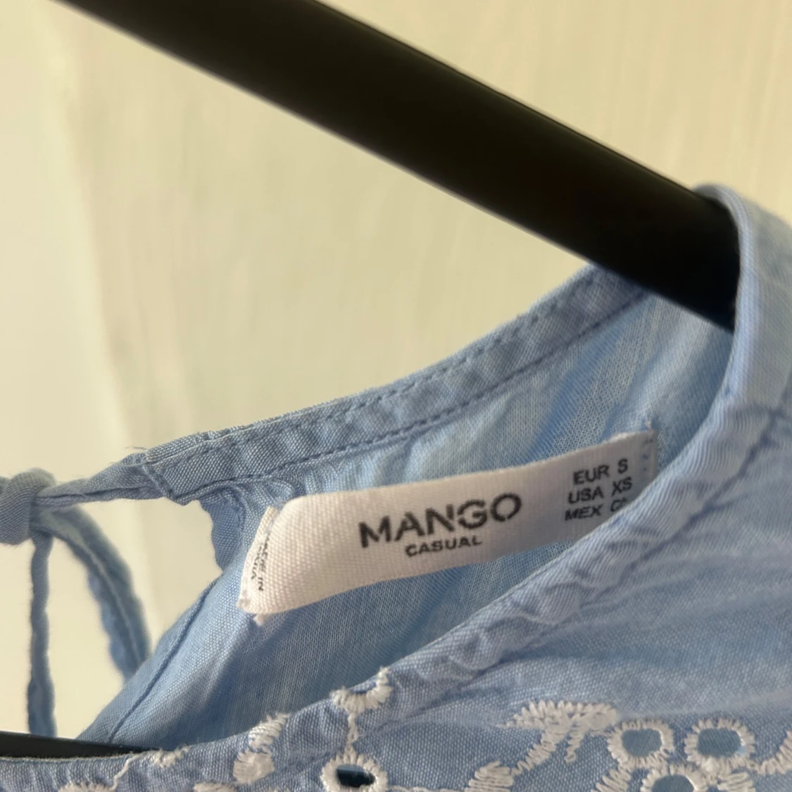 Supersöt ljusblå blus från Mango med broderade detaljer och hålmönster upptill och längst ner. Ärmlös modell med volangkant nertill och knytning i nacken.