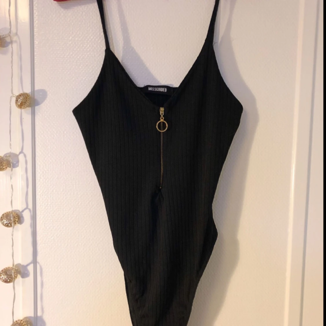 Svart body i ribbat tyg med knäppning och guldig dragkedja fram. Från Missguided i storlek 36 (passar säkert också M). Använd endast en gång. 40 kr + ev. fraktkostnad via Swish