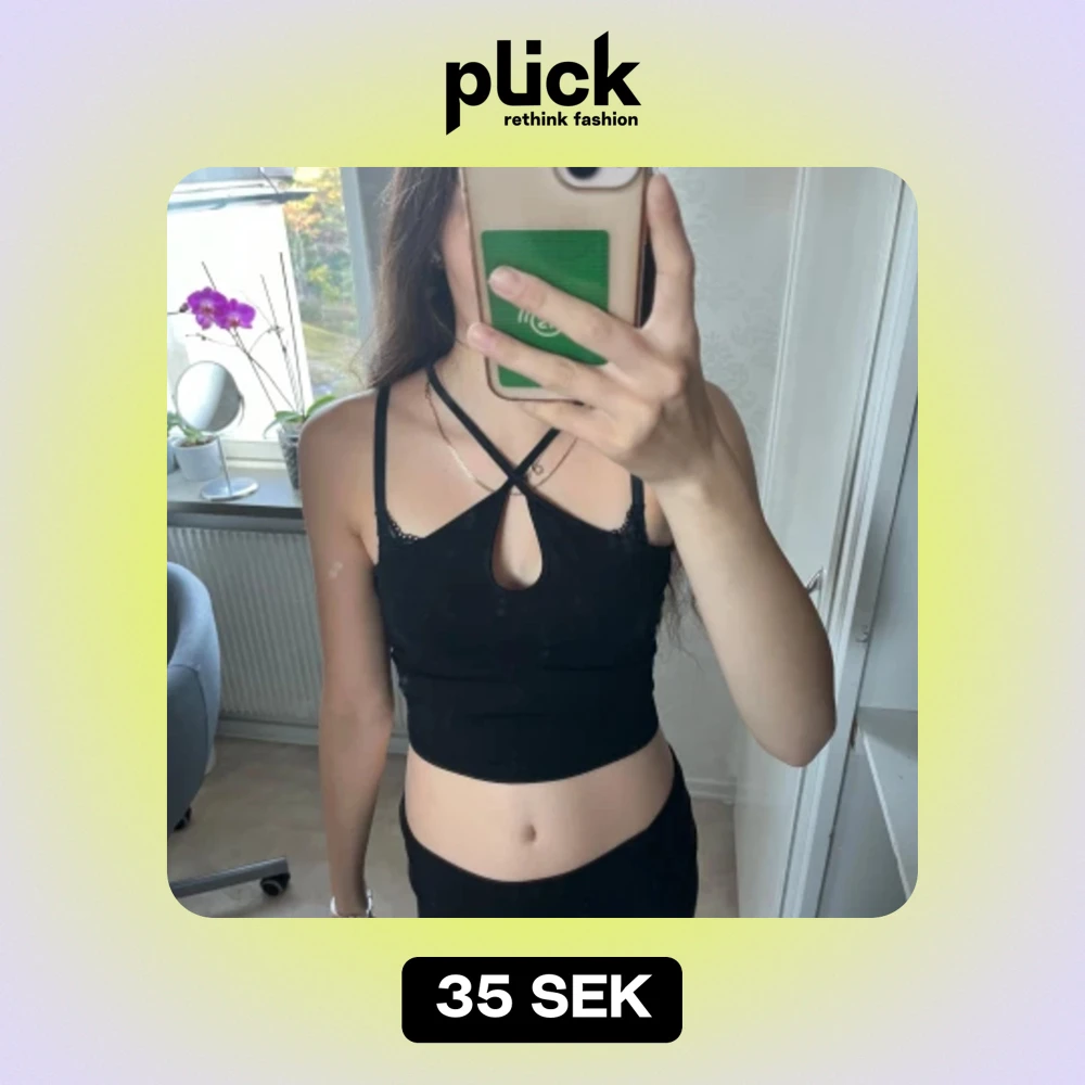 Säljer en snygg svart croppad linnetopp med smala axelband som korsas framtill. Toppen har en liten öppning vid bysten som ger en extra detalj. Perfekt för sommardagar eller en utekväll!
