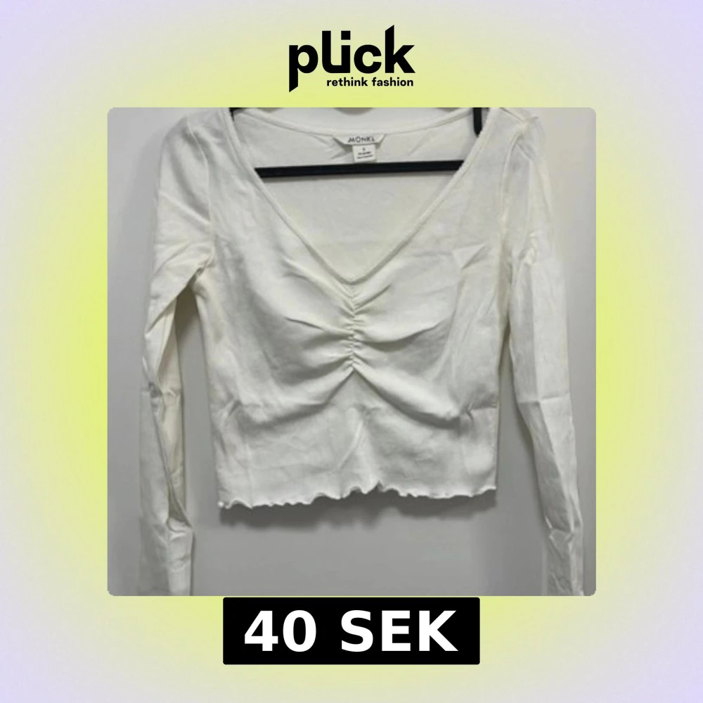 Säljer en vit långärmad topp från Monki med v-ringning och snygg rynkdetalj framtill. Toppen har croppad passform och vågig kant nertill. Perfekt att styla till jeans eller kjol!