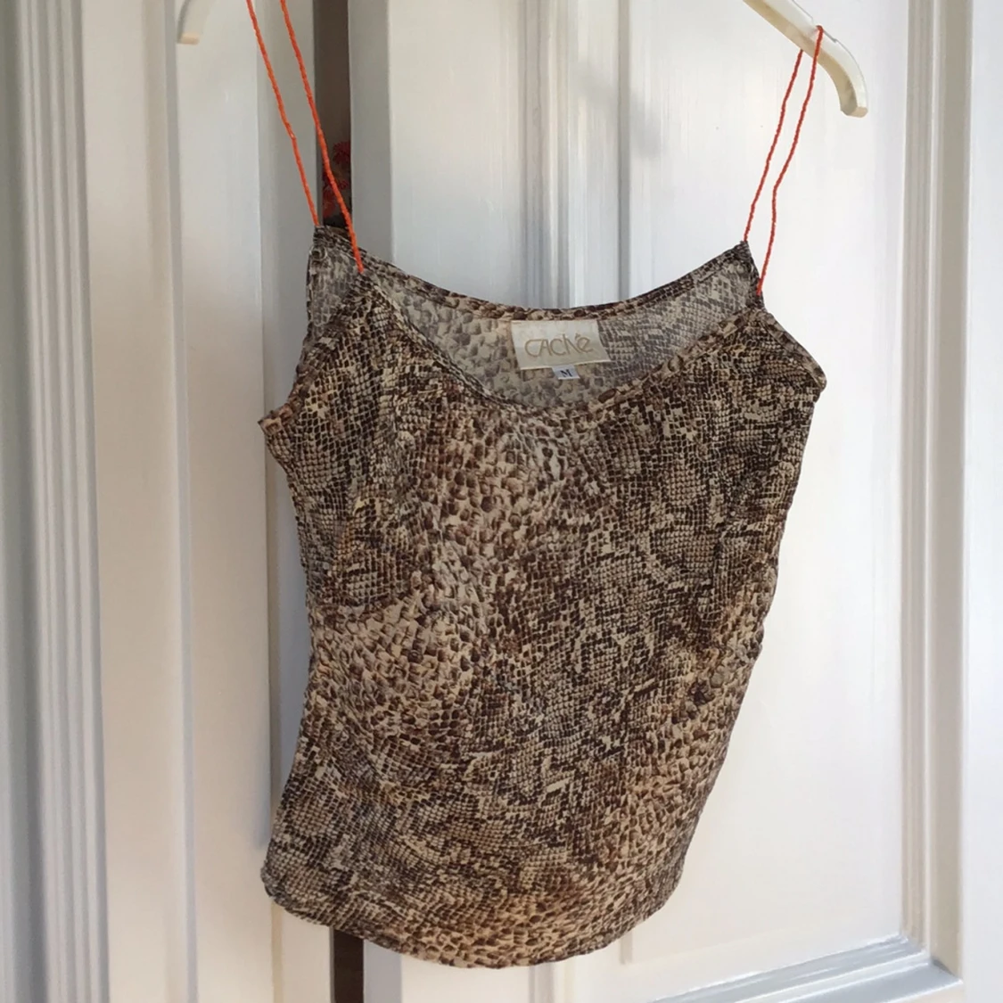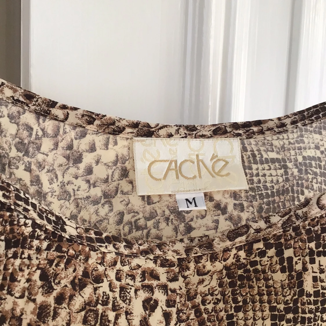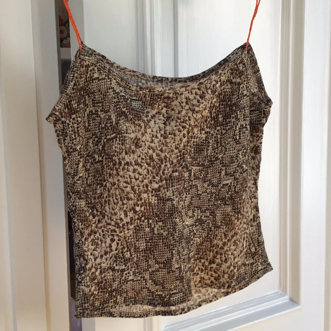 Säljer en snygg linnetopp från Cache med ett djurinspirerat mönster i bruna toner. Toppen har tunna axelband och en lös passform, perfekt för varma dagar. Passar bra till både jeans och kjol. 🐍