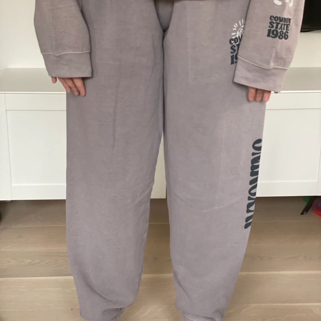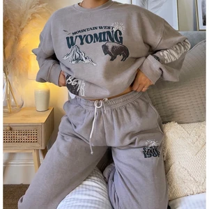 Ett gråbegie mjukisset med flera olika tryk på sweatshirten och även på byxorna. Setet är helt oanvänd och har lappar kvar. Byxorna är st XL och Sweatshirten i XL. frakt tillkommer