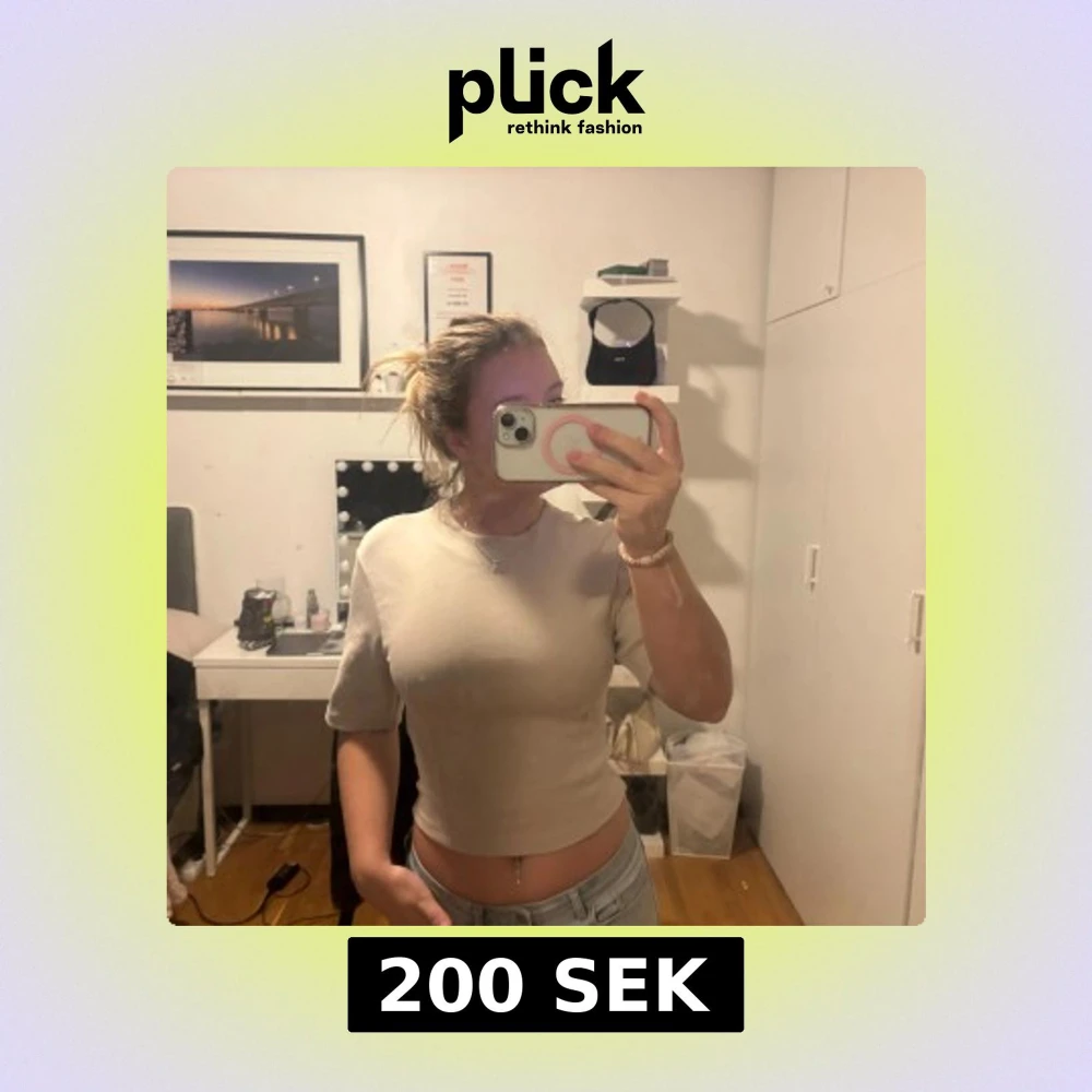 Säljer en beige croppad topp från Gina med korta ärmar och rund hals. Toppen har en slim passform och är tillverkad i mjuk bomull som sitter snyggt mot kroppen. Perfekt att matcha med jeans eller kjol för en clean look.