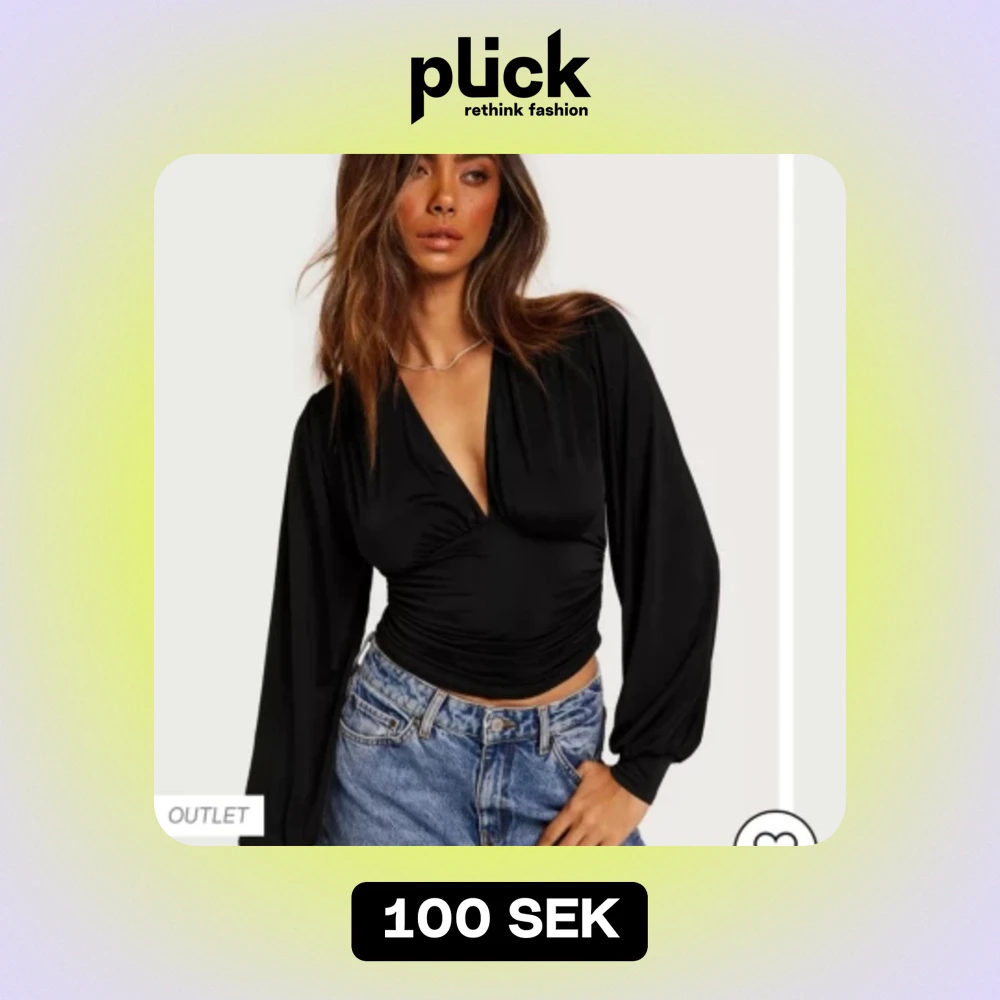 Plunge ls top - Säljer en svart omlottopp med lång ärm och djup v-ringning. Toppen har rynkade detaljer i sidorna och är tillverkad i ett mjukt, stretchigt syntetmaterial. Perfekt att styla med både jeans och kostymbyxor.