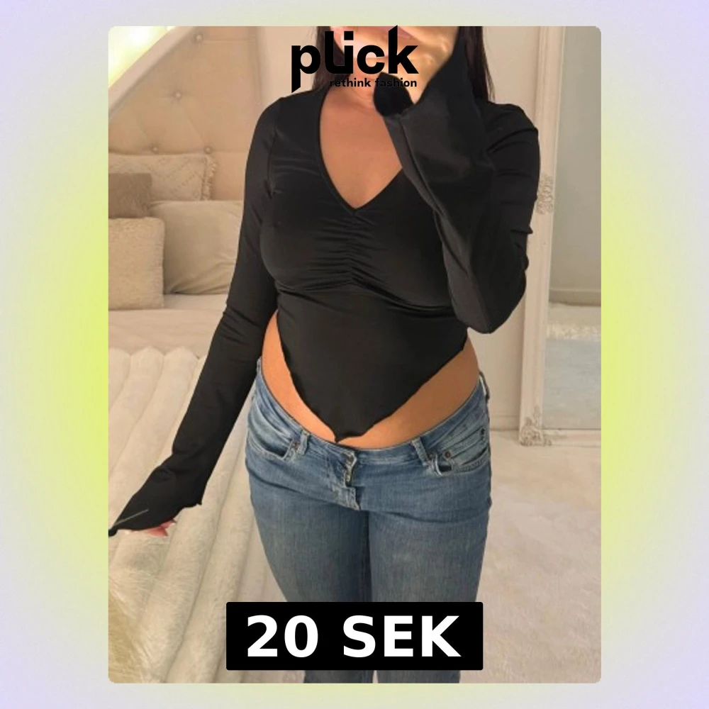 Säljer en svart långärmad polotopp med v-ringning och snygg rynkning vid bysten. Toppen är croppad med spetsig nederkant framtill och har en tight passform. Materialet känns mjukt och stretchigt, perfekt för att styla med jeans eller kjol.