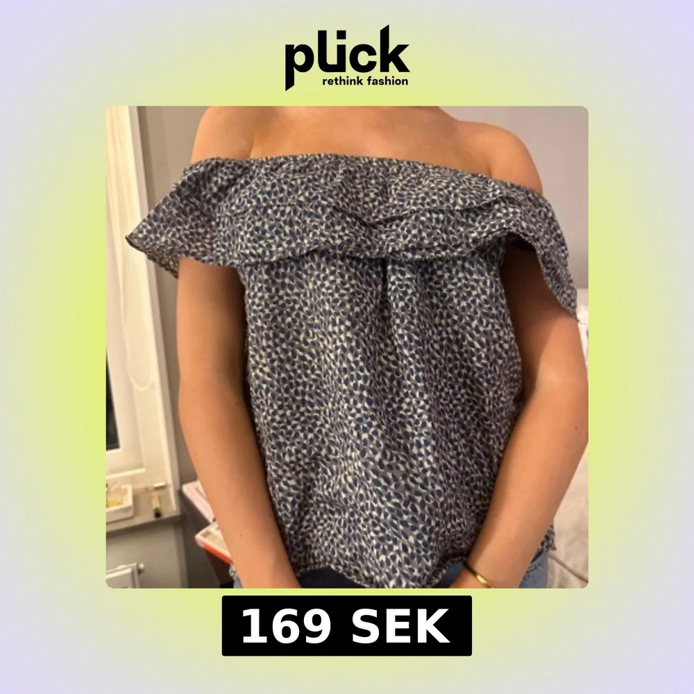 Jätte söt offshoulderblus med volang. Den är insydd i ryggen men går lätt att sprätta upp! Mönster i ett gröna, blå och vita toner🥰 storlek 146/152, men skulle definitivt säga att den passar både xs, s och m.