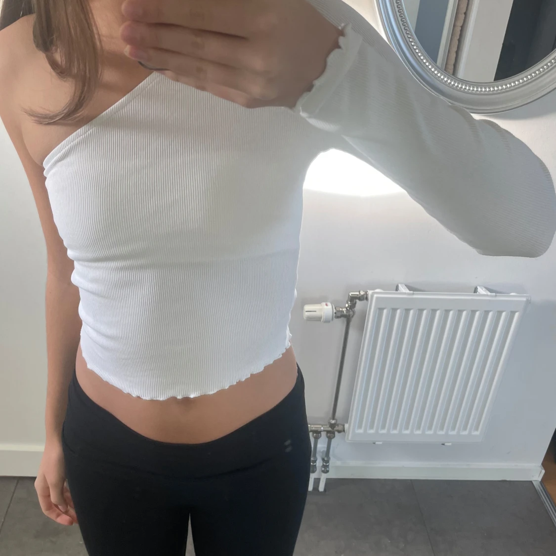 En jättefin tröja med en ärm. Den är ribbad och lite vågig längst ner på ärmen och tröjan💓