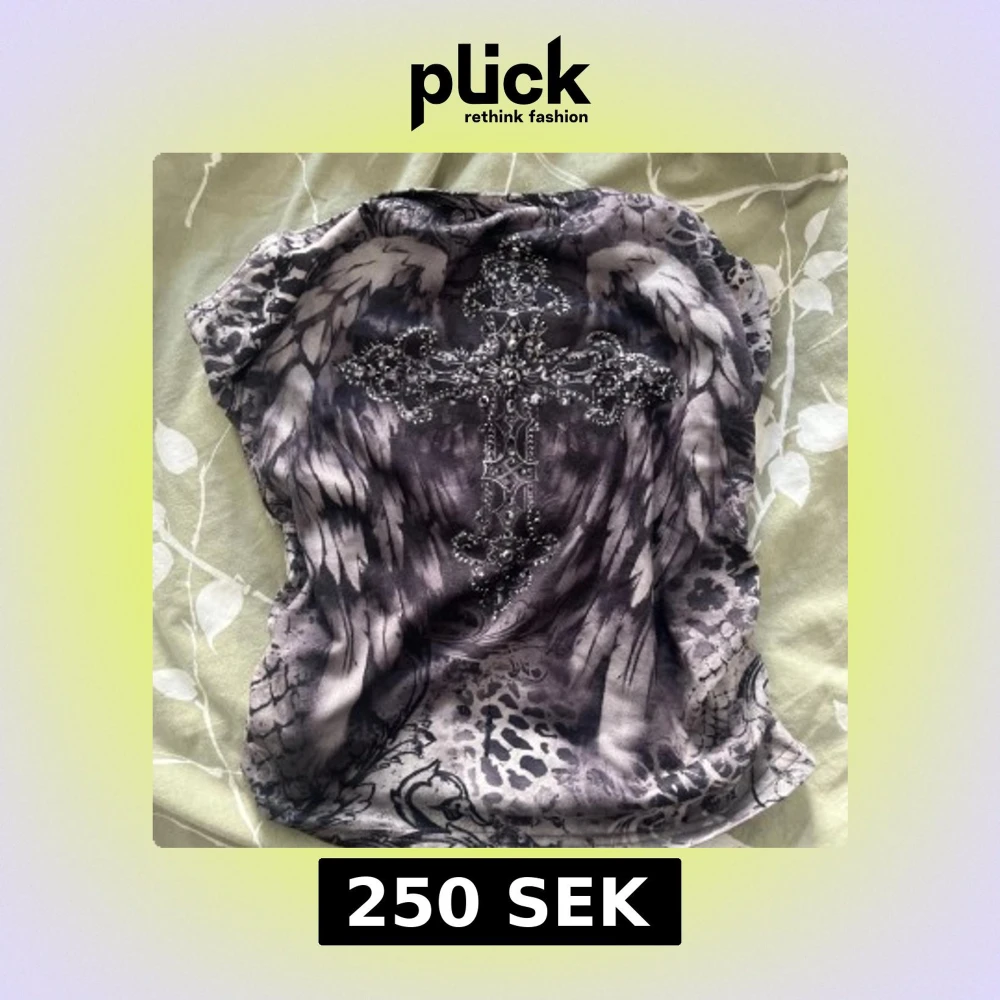 Säljer en tubtopp i gråsvart med coolt korsmotiv framtill dekorerat med svarta och silvriga stenar. Mönstret är en mix av fjädrar och djurprint, vilket ger en edgy vibe. Tyget är stretchigt och mjukt, perfekt för att sticka ut. Toppen är axelbandslös och har bandeau-stil.