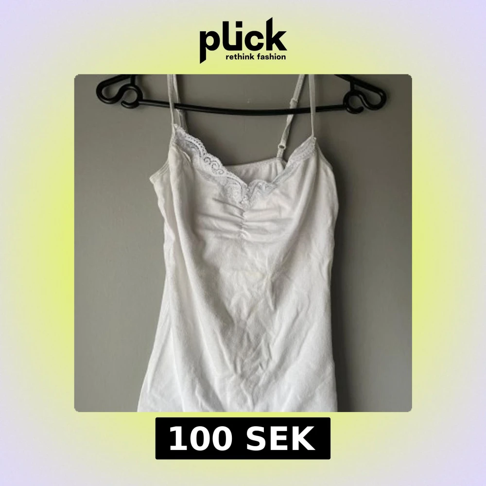 Strl xs/s. Säljer ett stilrent vitt linne med smala axelband och vacker spetsdetalj vid halsringningen. Perfekt för varma sommardagar eller som ett lager under en tröja.