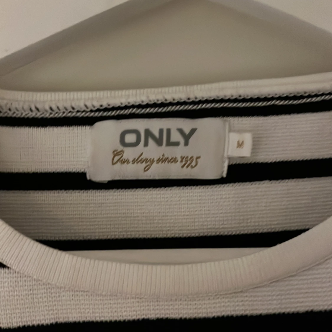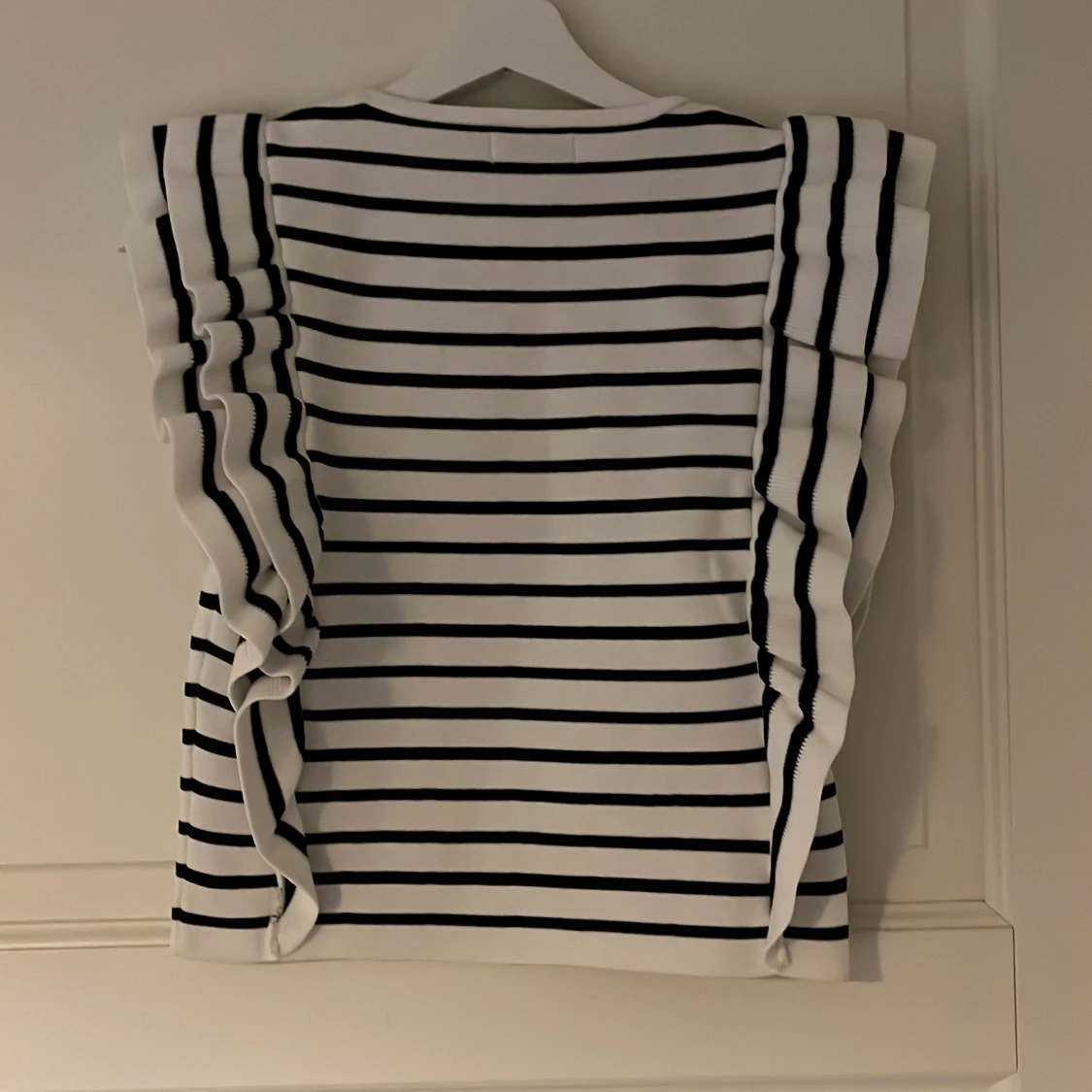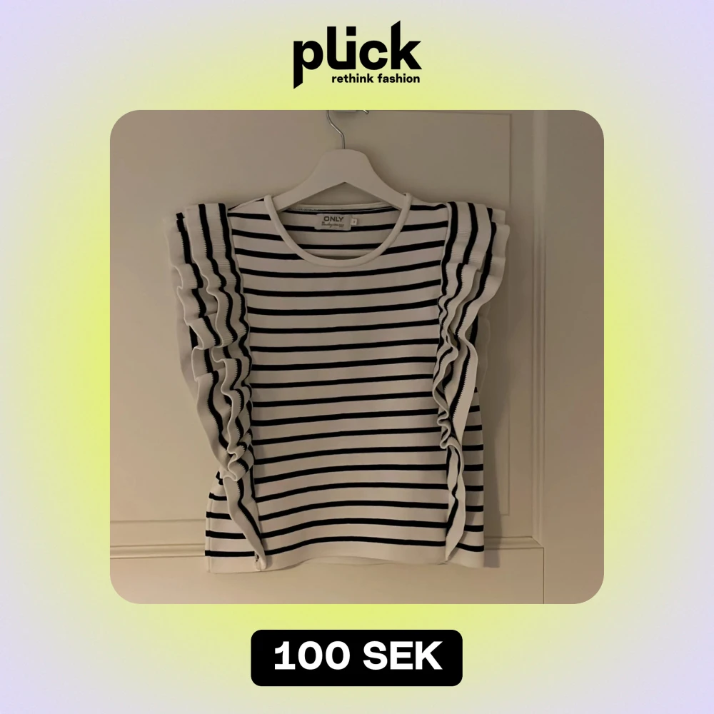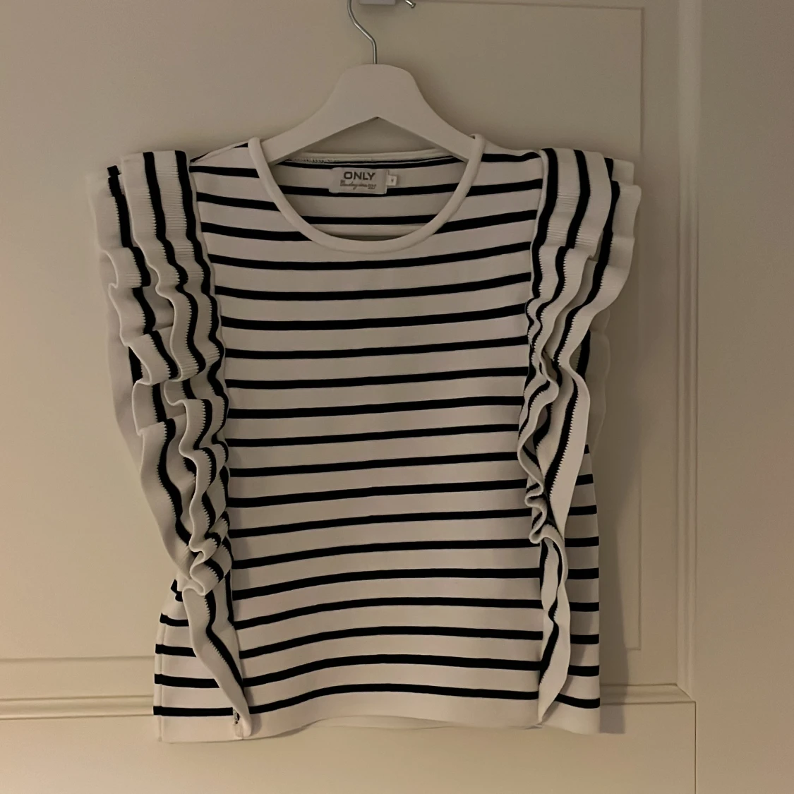 Säljer en superfin randig topp från ONLY i storlek M. Den är vit med svarta ränder och har volangdetaljer längs sidorna. Perfekt för både vardag och fest! 🖤🤍