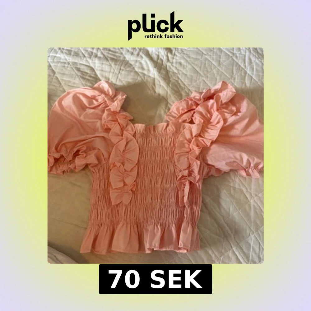 Supersöt ljusrosa blus med stora puffärmar och volangdetaljer längs axlarna och nederkanten. Smockad överdel ger en tight passform och blusen är ärmlös vid axlarna.