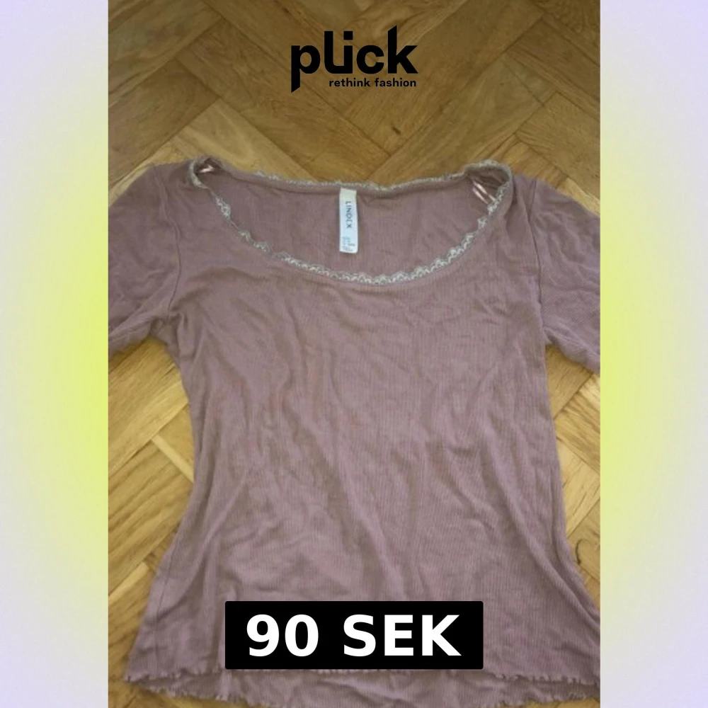 Supersöt ljusrosa ribbad topp från Lindex i storlek XS. Toppen har korta ärmar, rundad halsringning med grå spetsdetalj och vågig kant nedtill. Perfekt för dig som gillar romantiska och mjuka vibes.