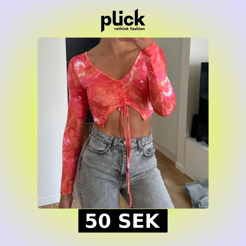 Säljer en croppad långärmad topp från SHEIN i rosa och rött med swirl-mönster. Toppen har v-ringning, snörning framtill och är figurnära. Perfekt för dig som gillar färgstarka plagg med coola detaljer.