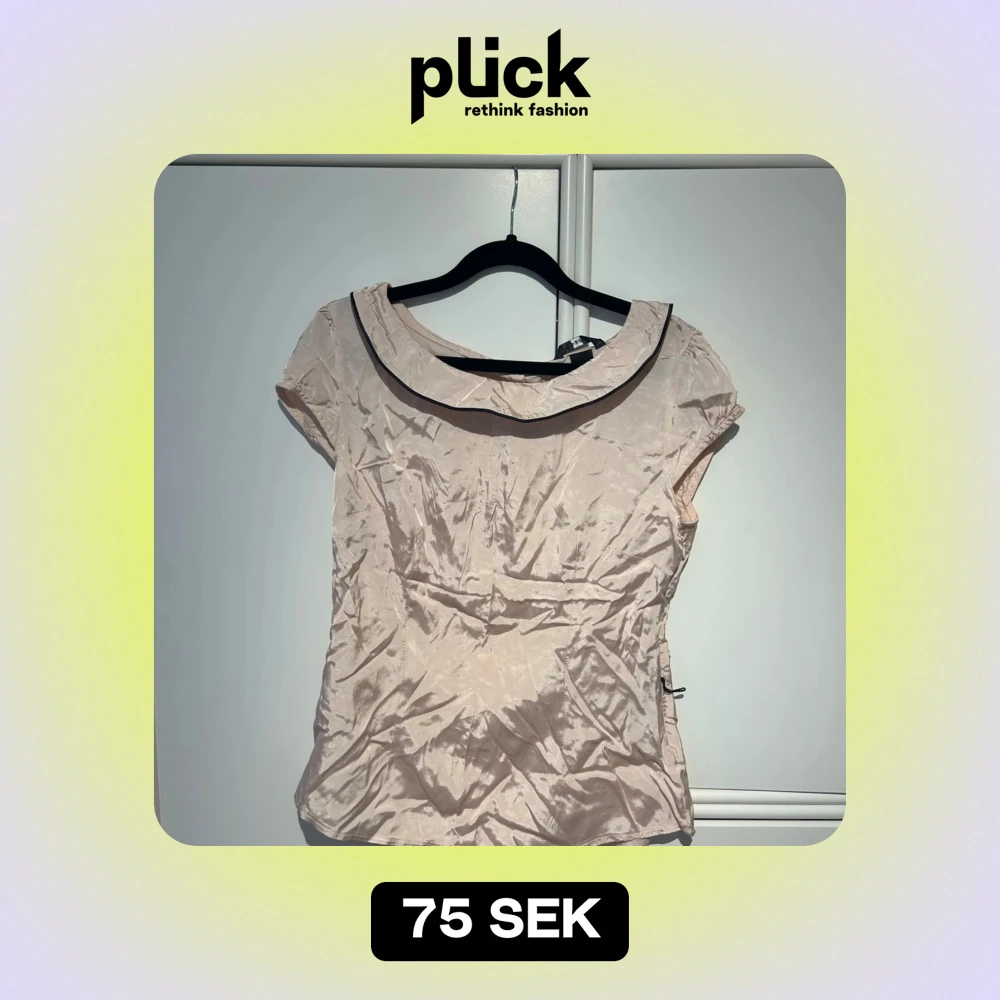 Säljer en elegant beige blus med svart kant runt halsen. Den har korta ärmar och är gjord i ett glansigt material som ger en lyxig känsla. Perfekt för både vardag och fest! Den har haft ett skärp i midjan därav de svarta trådarna på bild 4 med de går ju att klippa bort! Lappen säger 40 men skulle säga att den passar XS-M!