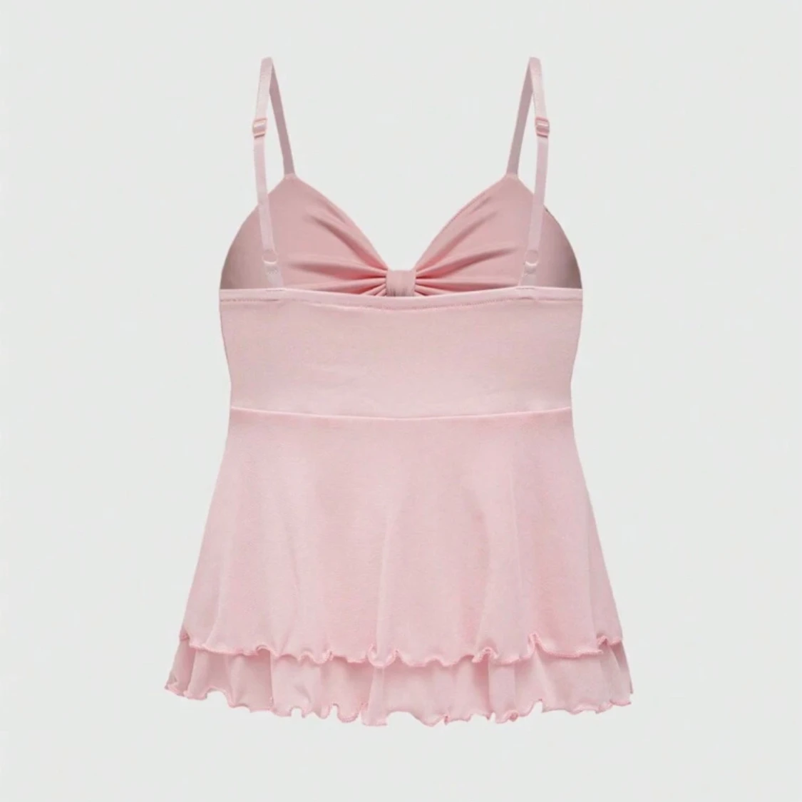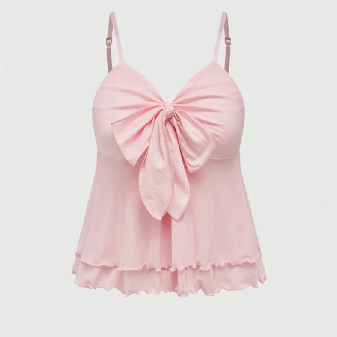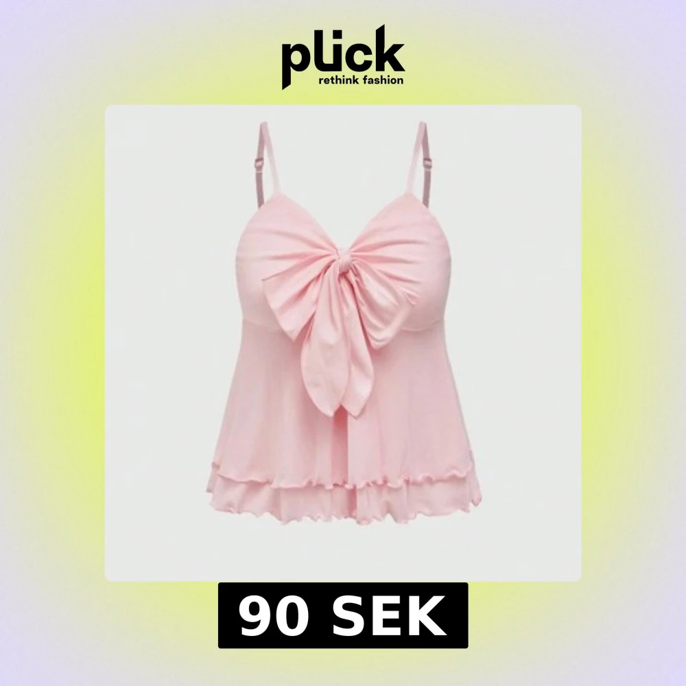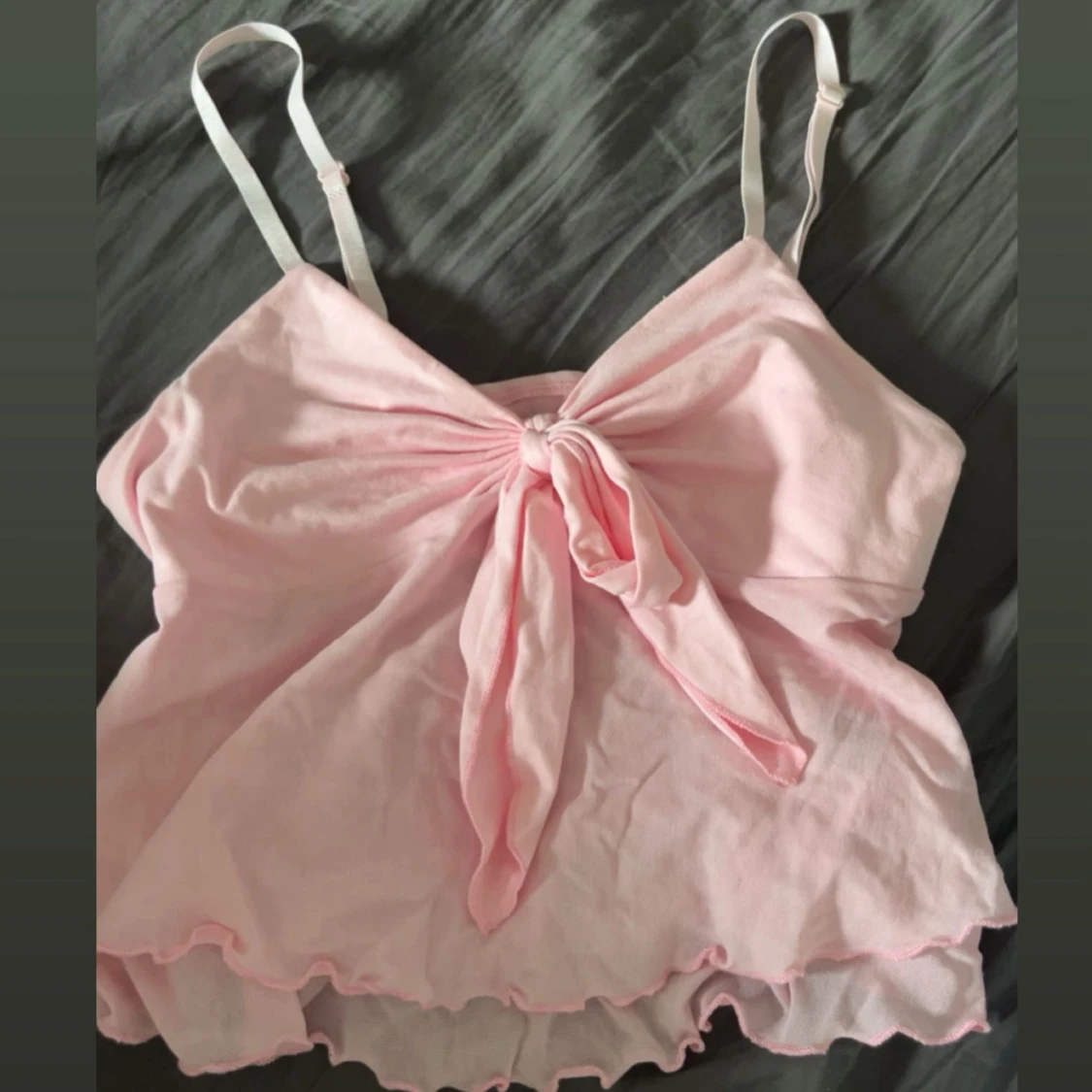Supersöt ljusrosa topp med rosett. Justerbara smala axelband. Perfekt för sommardagar.