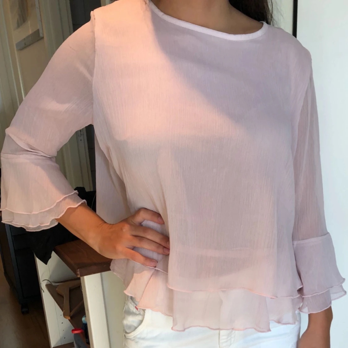 Superfin rosa topp med volanger nedtill och på ärmarna. Strl 38/40.