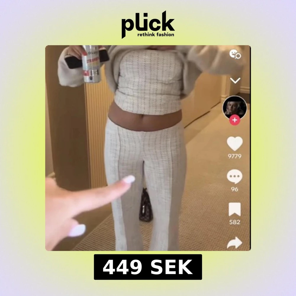 Säljer en beige bandeau tubtopp i tweed-look med diskret rutigt mönster. Toppen är axelbandslös och croppad, perfekt att styla med matchande byxor eller kjol. Ger en clean och trendig vibe med sin strukturerade form och ljusa färgton.