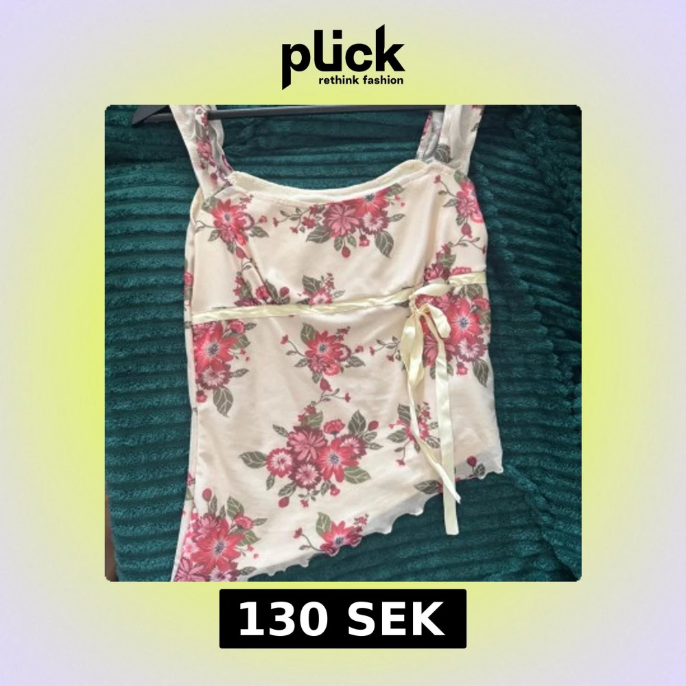 Supersöt linnetopp i ljusbeige med rosa och röda blommor, gröna blad och en söt rosett i satinband vid midjan. Toppen har breda axelband och vågig nederkant för extra detalj. Perfekt för en somrig vibe!