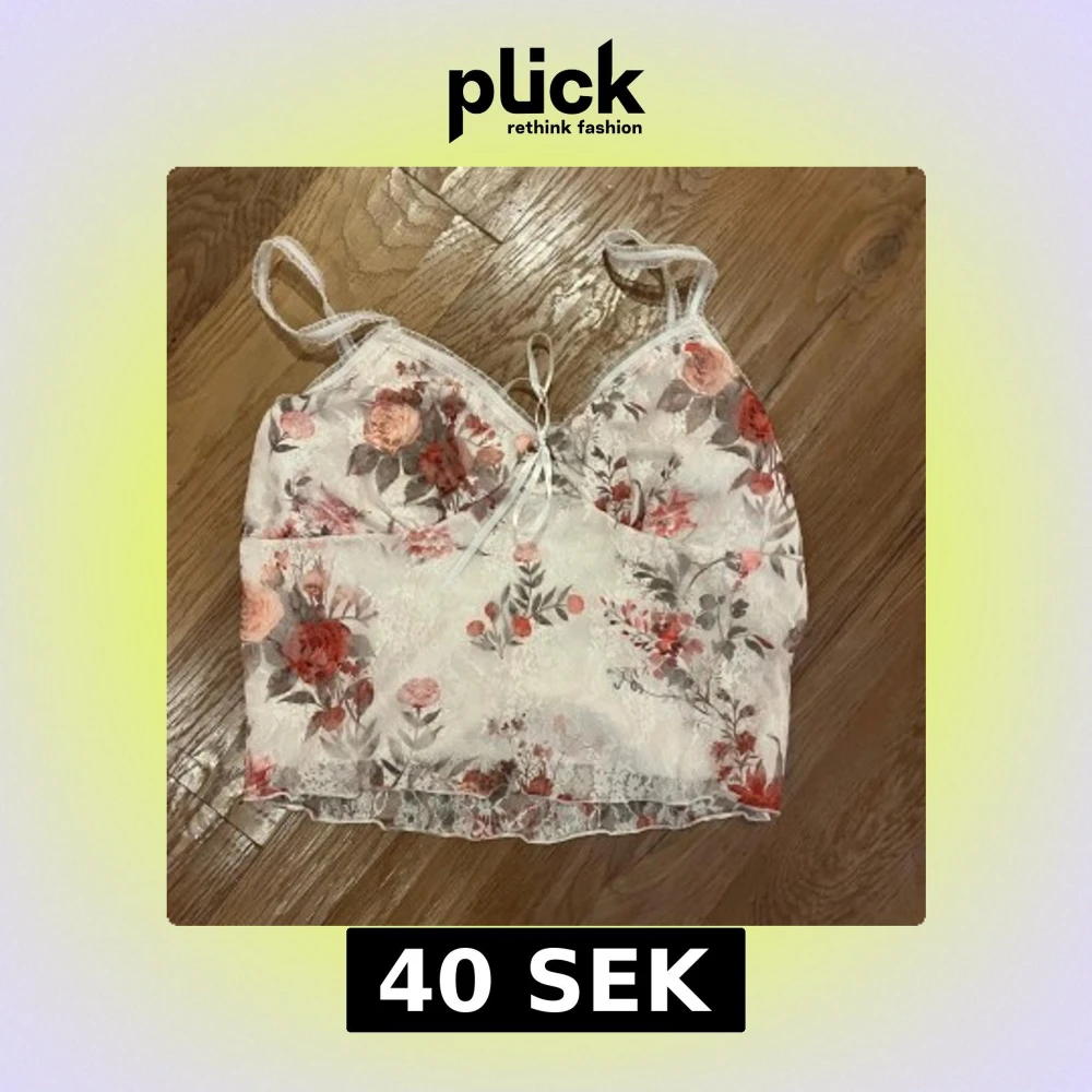 Säljer en romantisk linnetopp med blommigt mönster i rött och rosa på vit spets. Toppen har smala axelband, söt snörning framtill och genomskinliga spetsdetaljer längs nederkanten. Perfekt för dig som gillar en feminin och trendig stil.