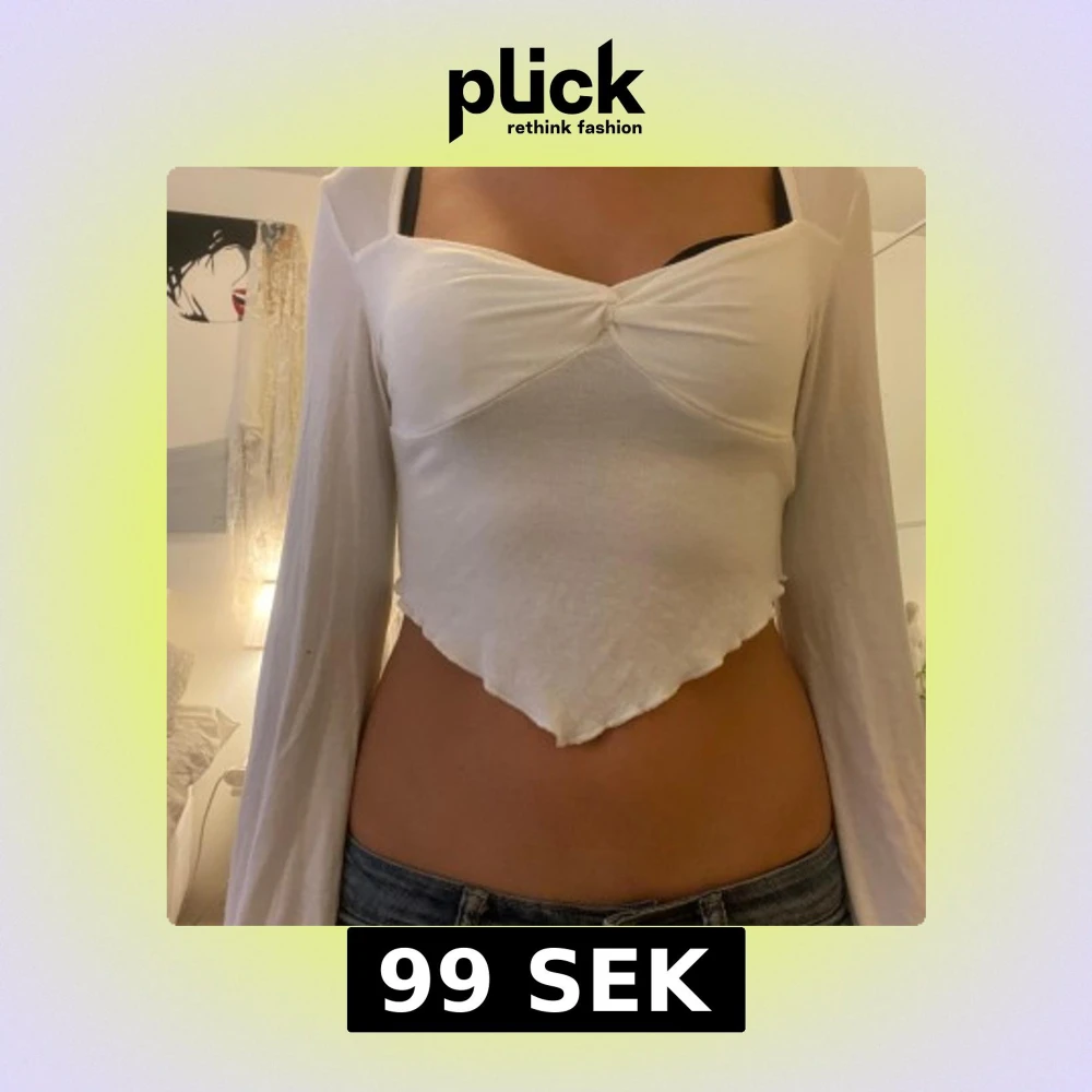 Säljer en vit croppad topp med långärmade trumpetärmar och twistad detalj framtill. Toppen har en snygg v-ringning och spetsig nederkant som ger en cool och trendig look. Mjuk och stretchig i materialet, perfekt att styla med jeans eller kjol.
