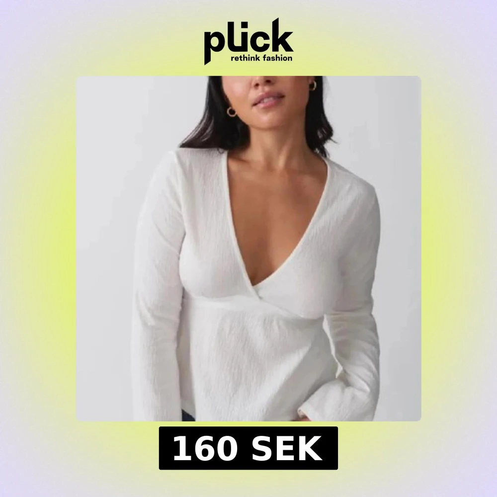 Säljer en vit omlottopp med lång ärm och djup v-ringning. Toppen har en snygg knytning i ryggen och är gjord i ett lätt, strukturerat tyg som ger en fräsch känsla. Perfekt att styla med jeans eller kjol för en clean look.
