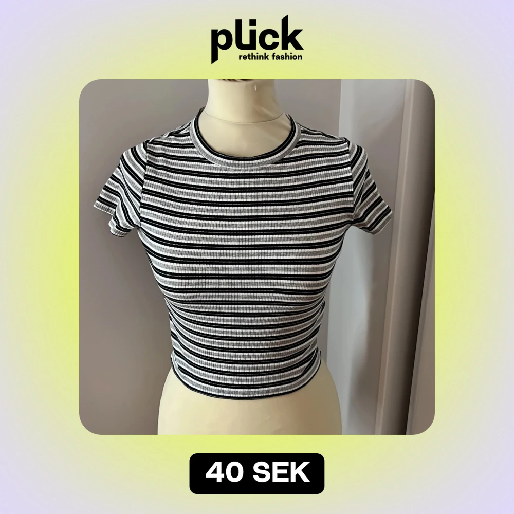Säljer en superfin randig topp i svart och vit. Den är ribbad och har en croppad passform som är perfekt för sommaren. Toppen har korta ärmar och en rund halsringning. Perfekt för en avslappnad dag eller en somrig utflykt!