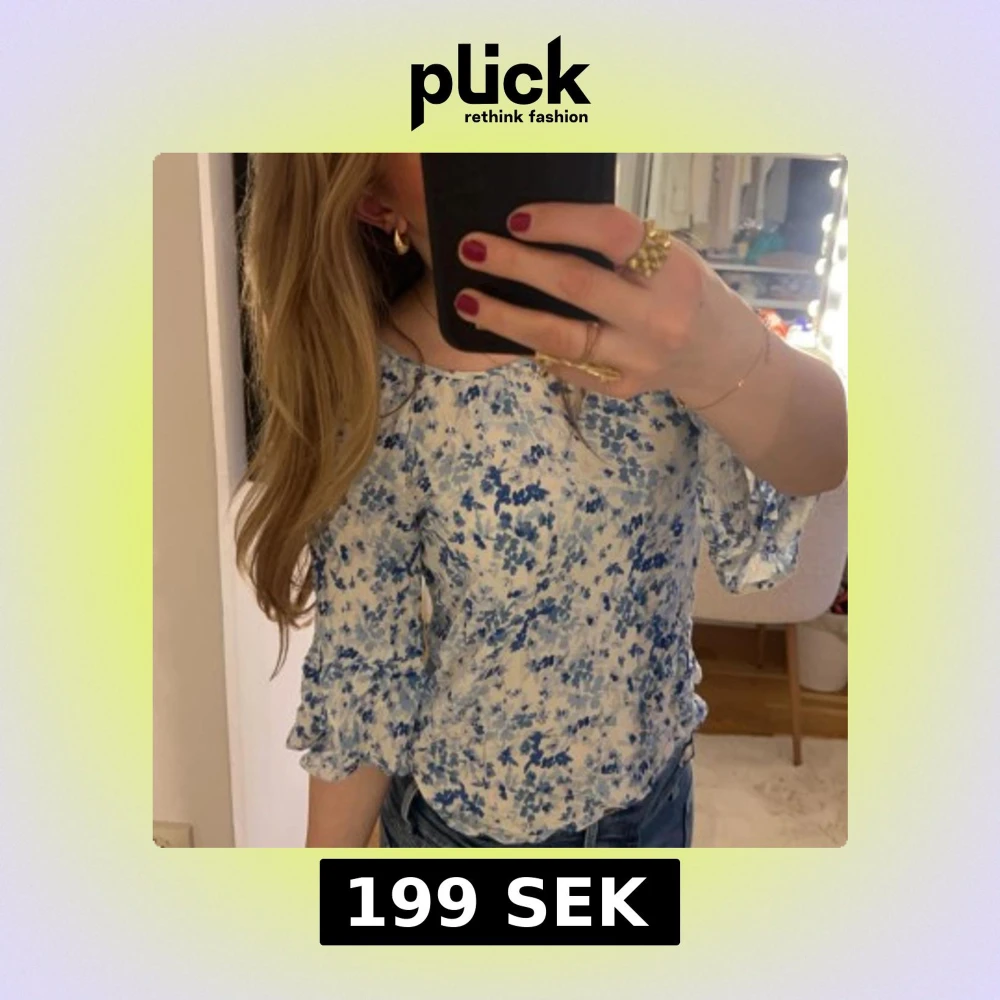 Säljer en söt blommig blus i blått och vitt med trekvartsärm och volangdetaljer. Perfekt för vår och sommar! 💙Älskar