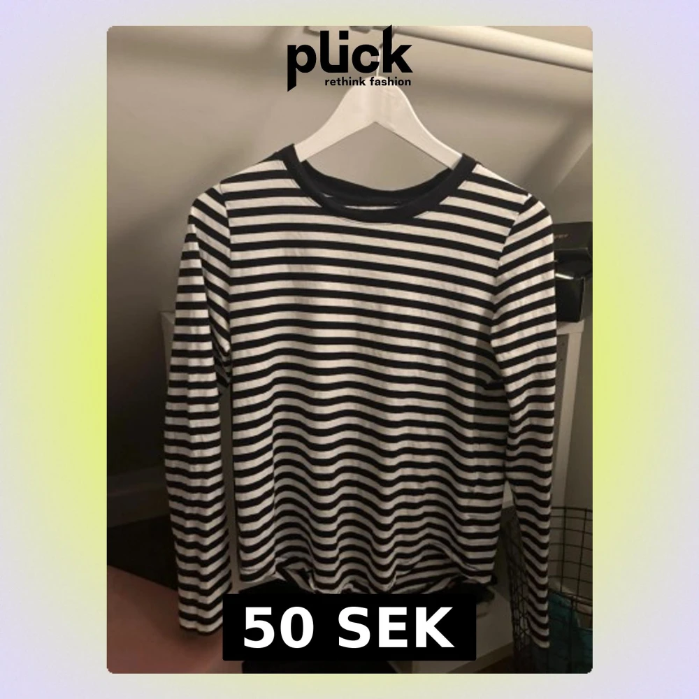 Jag säljer en långärmad svartrandig tröja, den har inget märke tyvärr så vet inte var den är ifrån. Den är väldigt fin och säljs för att den inte har används. Storleken är oklar men den passar bra på mig som vanligtvis är en storlek S i tröjor