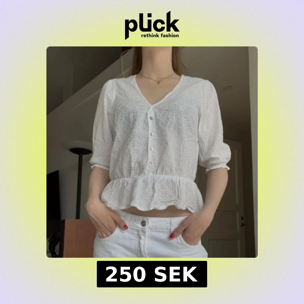 Superfin vit blus med v-ringning, knappar framtill och broderade detaljer. Blusen har trekvartsärm, volang nertill och är lätt croppad. Perfekt för en fräsch och somrig look!