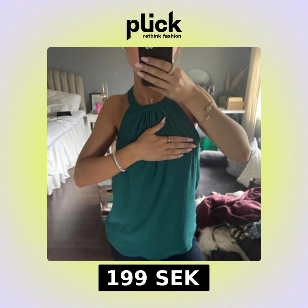 Snygg grön ärmlös topp med halterneck-design. Perfekt för varma dagar eller sommarens fester. Toppen har en lös passform och är tillverkad i ett lätt material som ger en bekväm känsla.