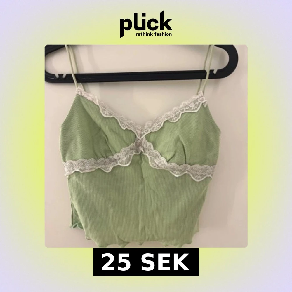 Söt ljusgrön ribbad linnetopp med tunna axelband och vit spets längs halsringning och under bysten. Toppen har croppad passform och vågig nederkant. Lite nopprig är den vid armhålan. Perfekt för varma dagar eller som ett lager under en skjorta.