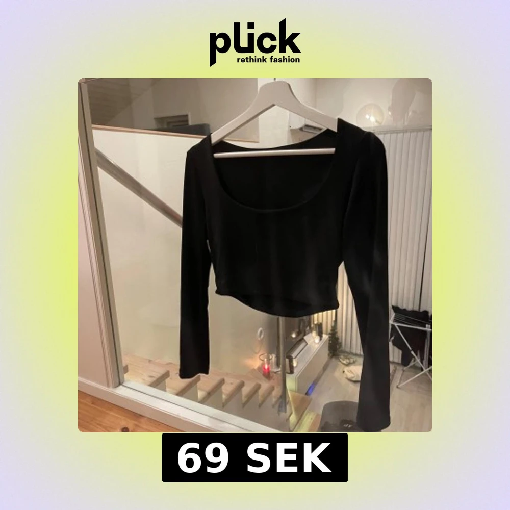 Säljer en svart croppad topp med lång ärm och djup rundad halsringning. Enkel och stilren design som passar till många olika outfits. Materialet känns mjukt och stretchigt mot huden.