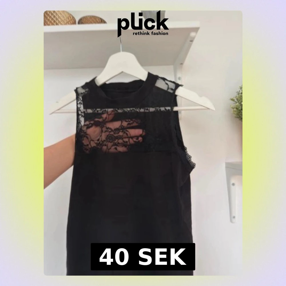 Säljer en svart ärmlös topp med transparent spets upptill och runt axlarna. Toppen har en hög halsringning och ett elegant, feminint uttryck tack vare spetsen. Perfekt att styla med både jeans och kjol för en trendig look.