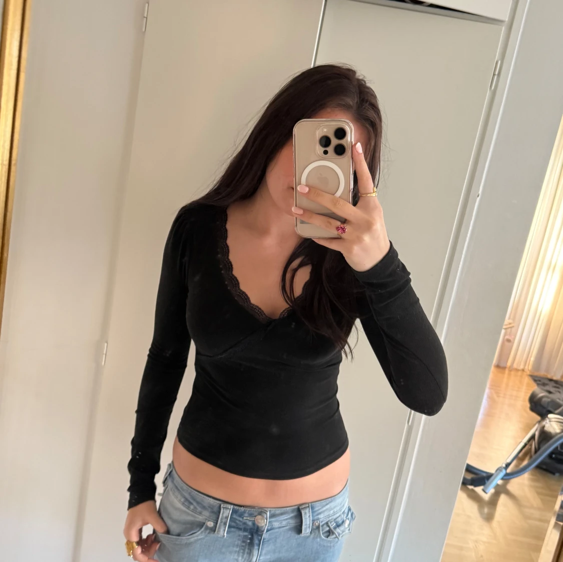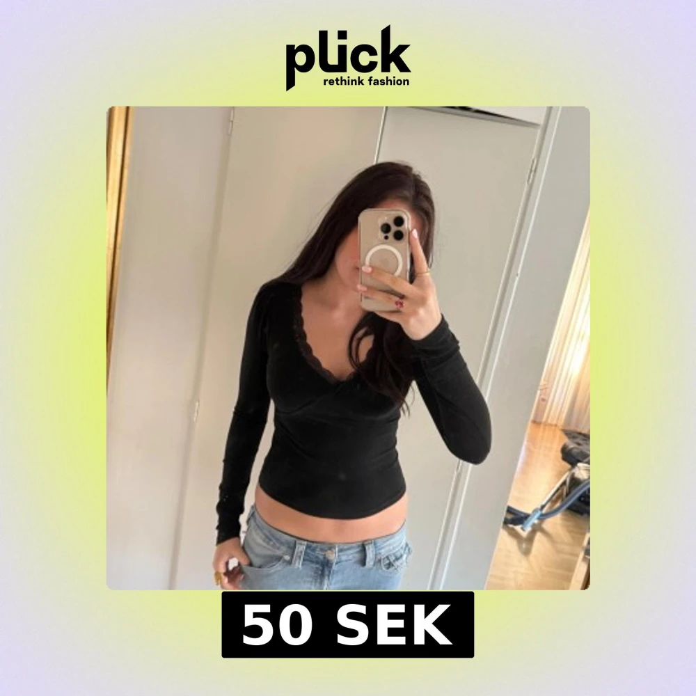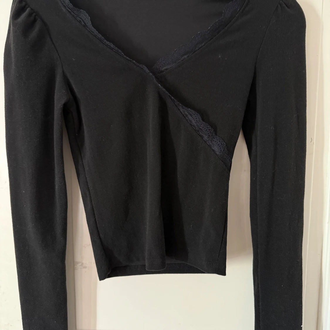 Snygg svart omlottopp med spetsdetaljer längs den v-ringade halsen. Den kommer tyvärr inte till användning och har använts få tal gånger
