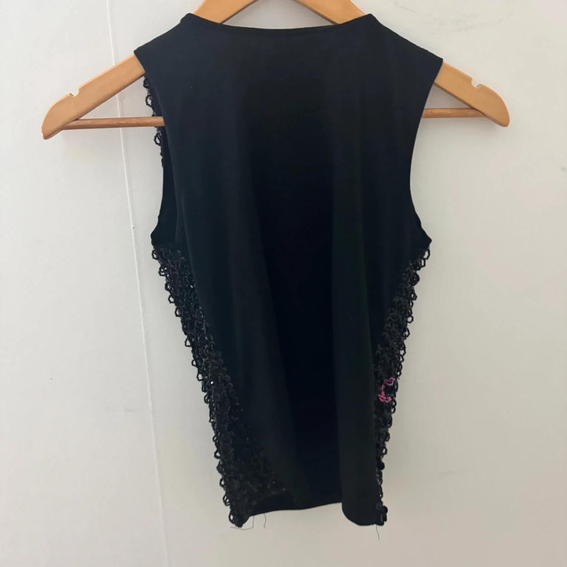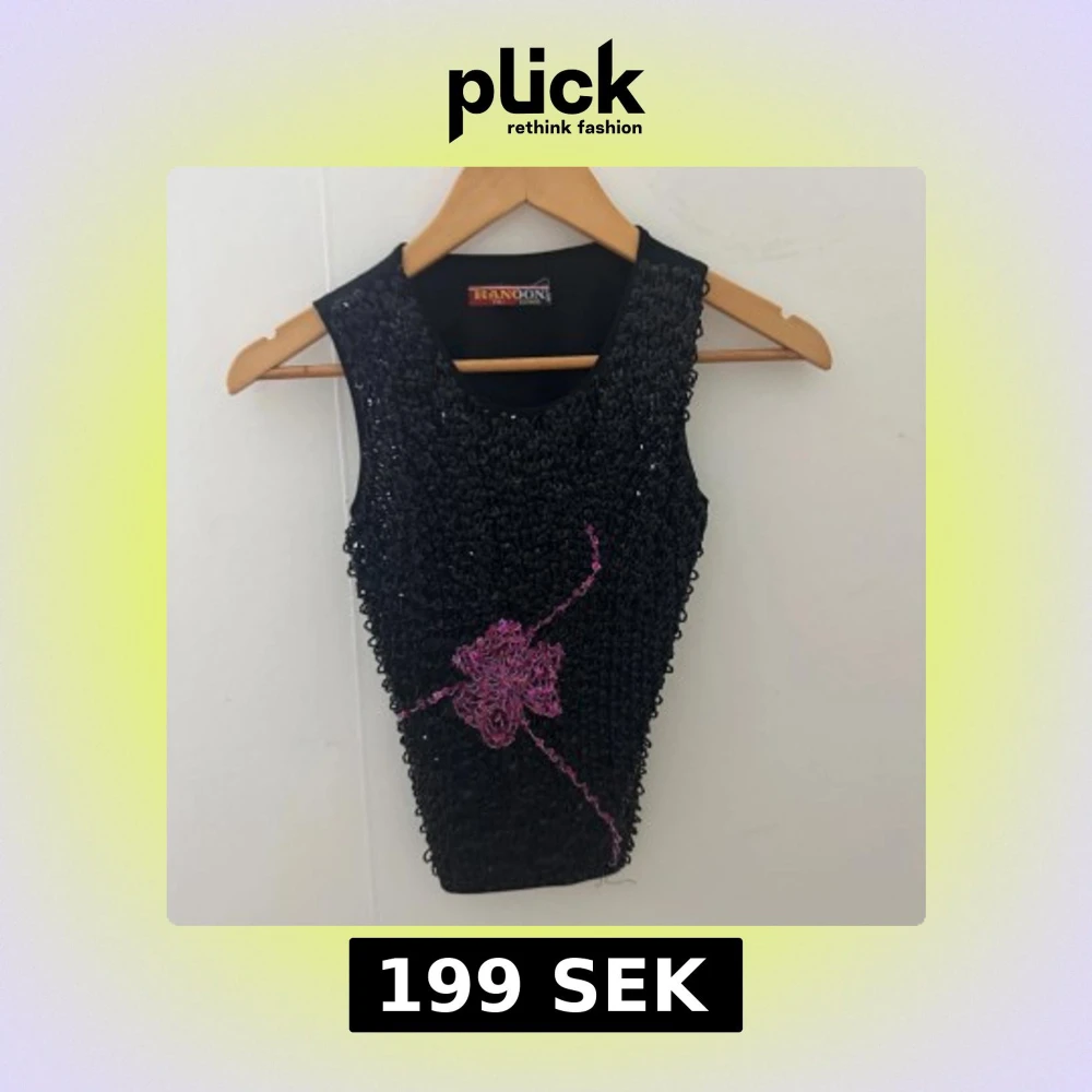 Snygg svart ärmlös topp från utomlands med glittriga paljetter framtill och ett rosa blommotiv. Toppen har en croppad passform och slät baksida i stretchigt material. Perfekt för dig som vill sticka ut med lite extra bling. Aldrig använt den