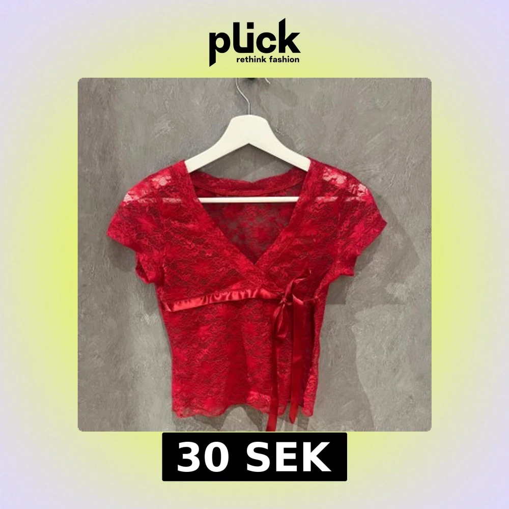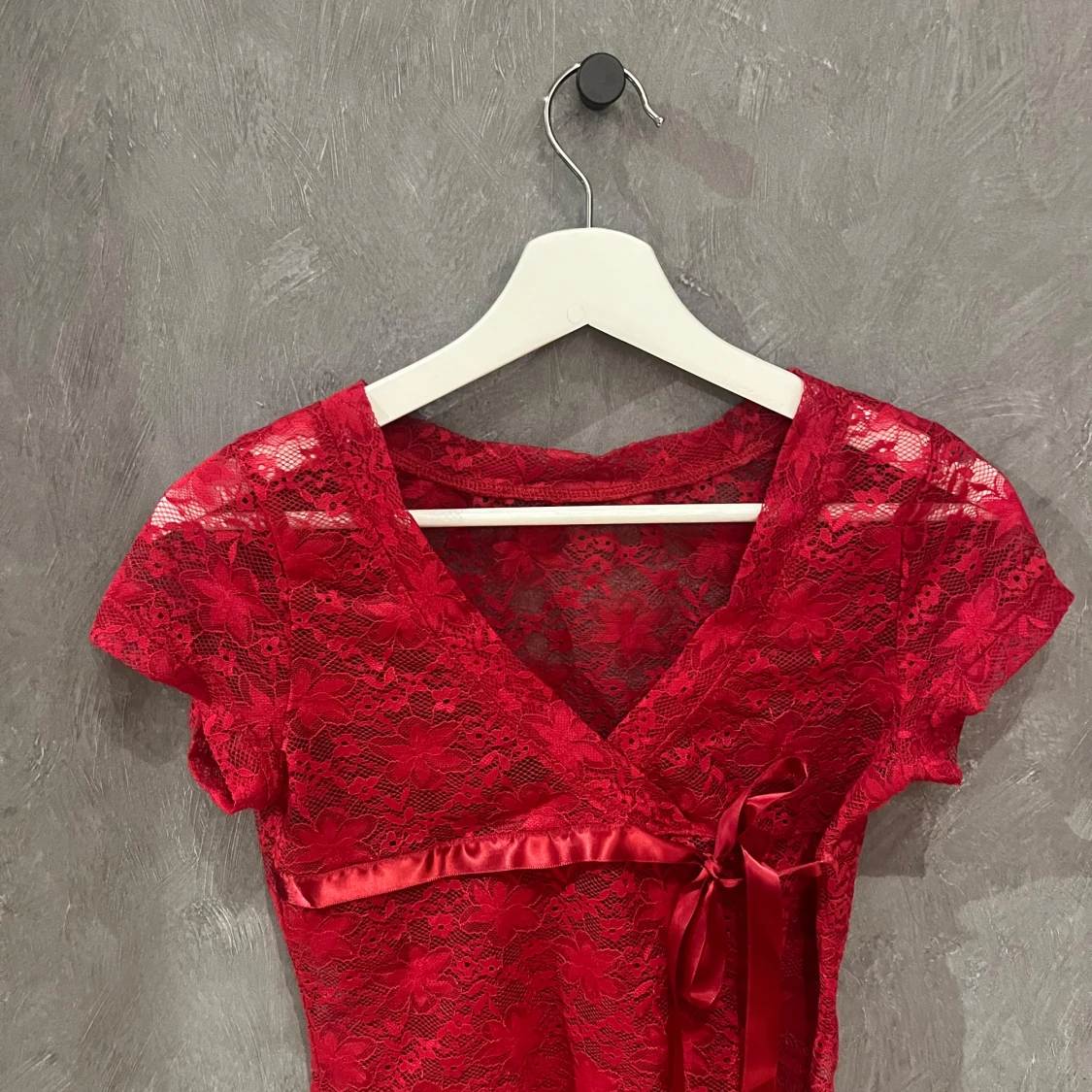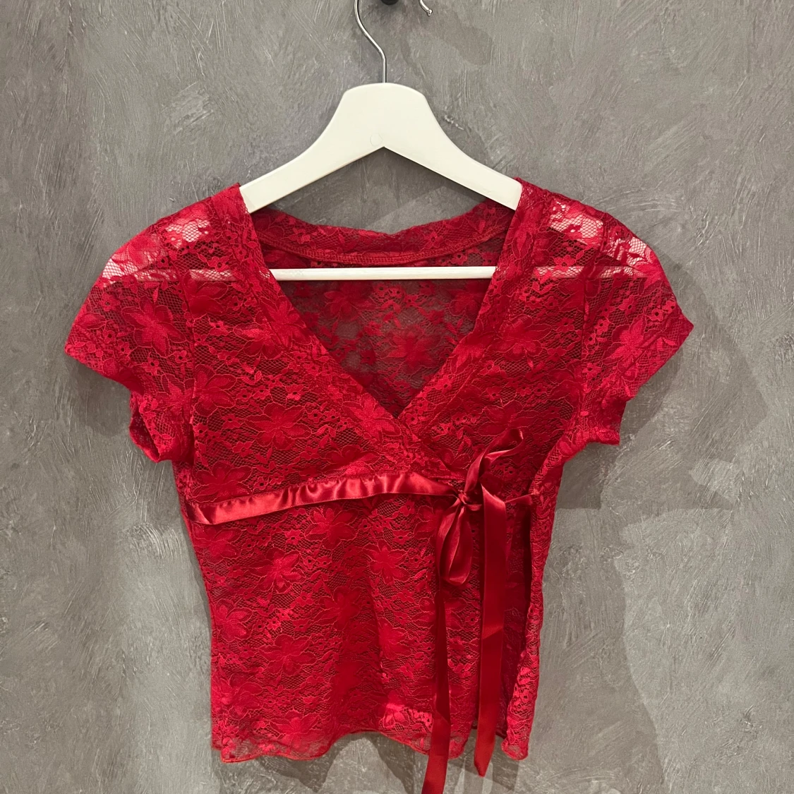 Snygg röd spetsblus med korta ärmar och v-ringning. Tror storlek s