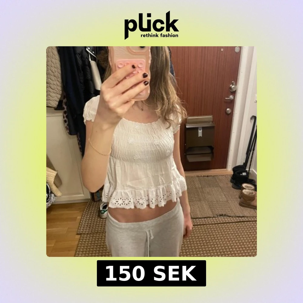 Säljer en söt vit blus med spetsdetaljer och korta ärmar. Blusen har en elastisk överdel och volangkant nedtill,Perfekt för varma dagar!