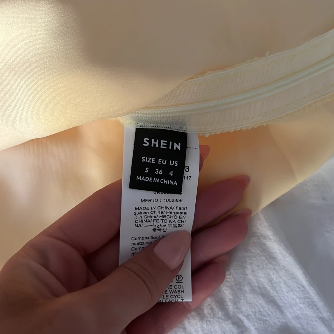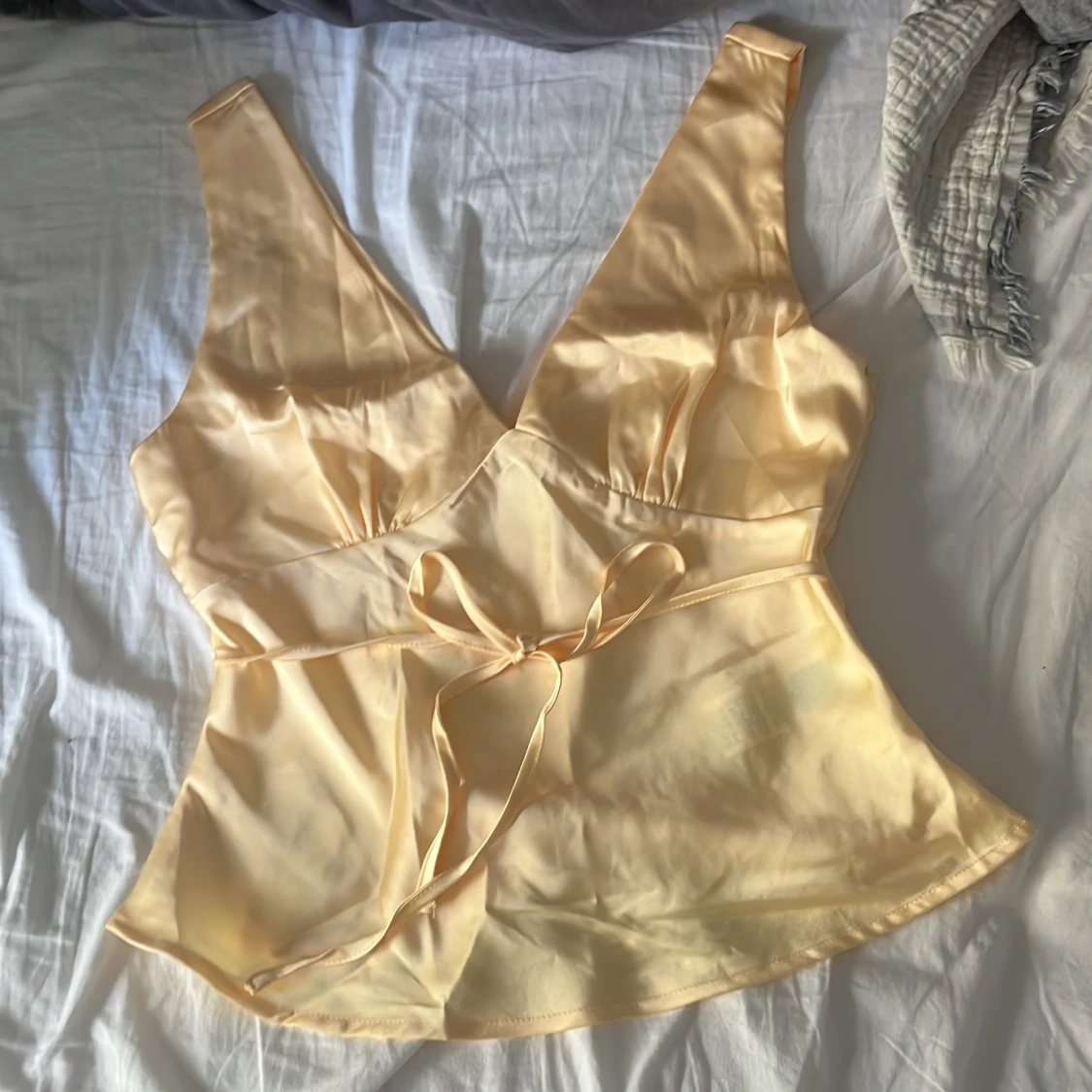 Säljer en ljusgul omlottopp från SHEIN i satinliknande polyester. Toppen har djup v-ringning, breda axelband och knytband i midjan som ger en snygg siluett. Perfekt till jeans eller kjol för en fräsch look.