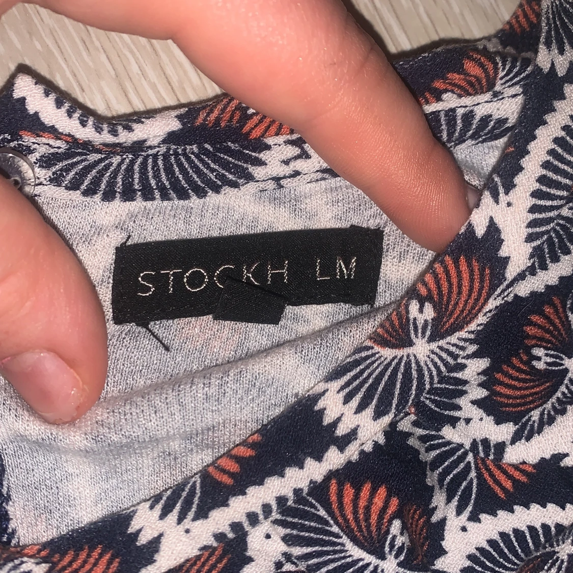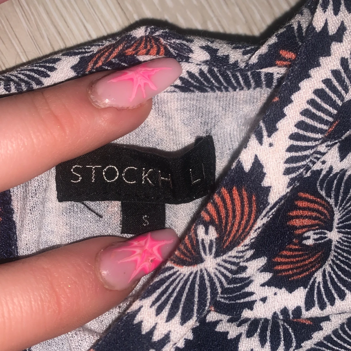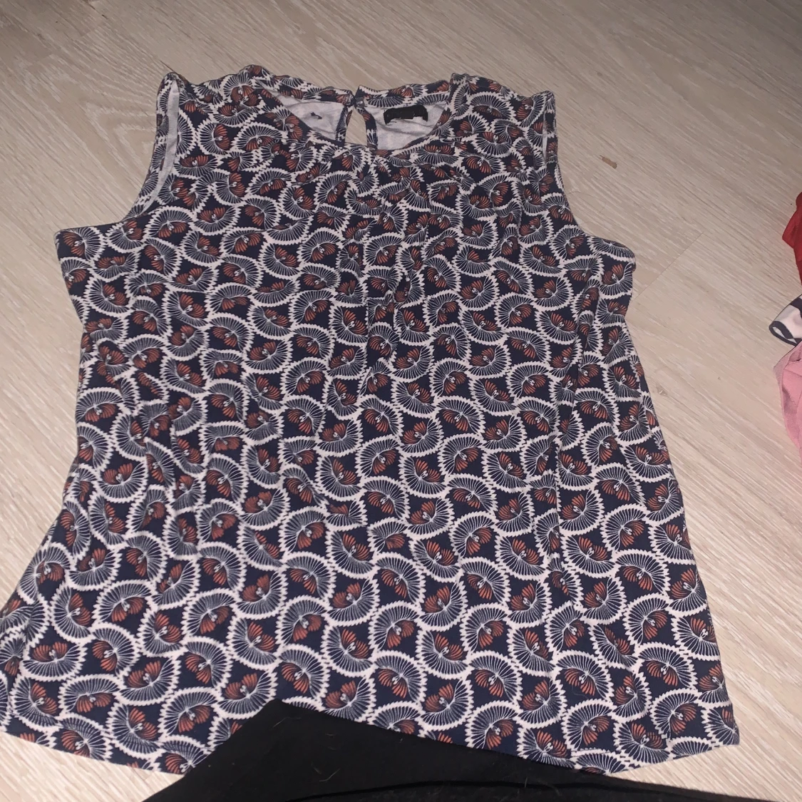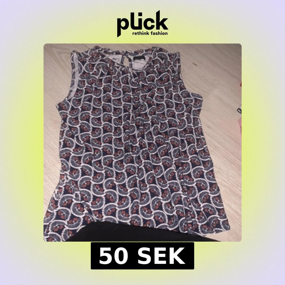 Snygg ärmlös topp från Stockh LM med ett unikt mönster i marinblått, vitt och orange. Perfekt för en stilren look. Toppen har en rund halsringning och knytning i nacken. Storlek S men är ganska stretchig så M och kanske till och med L skulle nog kunnas ta på sig denna