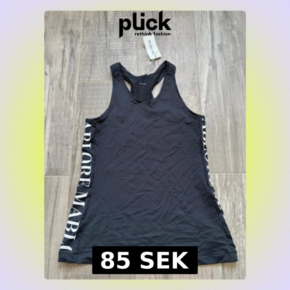 Säljer en svart fitness linnetopp från Mablore i storlek S. Toppen har breda axelband och racerback-design, med vit text längs sidorna. Materialet är mjukt och stretchigt, perfekt för träning. Snygg och sportig look med stilren logga.