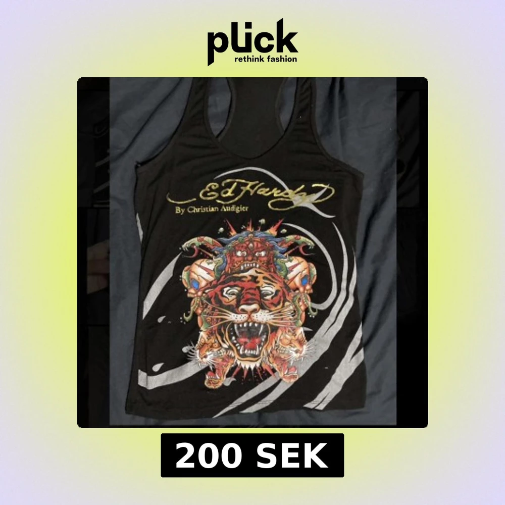 Snyggt svart linne från Ed Hardy med ett färgglatt tigertryck och guldtext på framsidan.