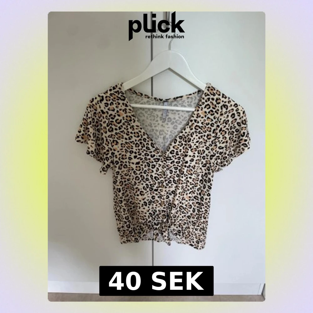 Snygg topp med leopardmönster i beige, svart och bruna toner. Modellen har korta ärmar, v-ringning och knyt framtill. Lätt och mjukt material