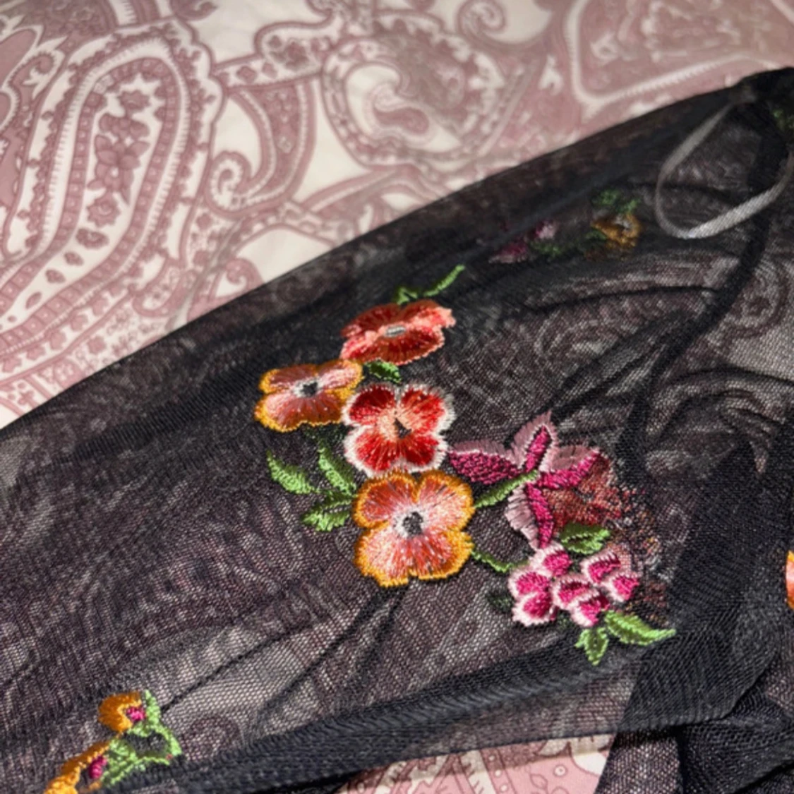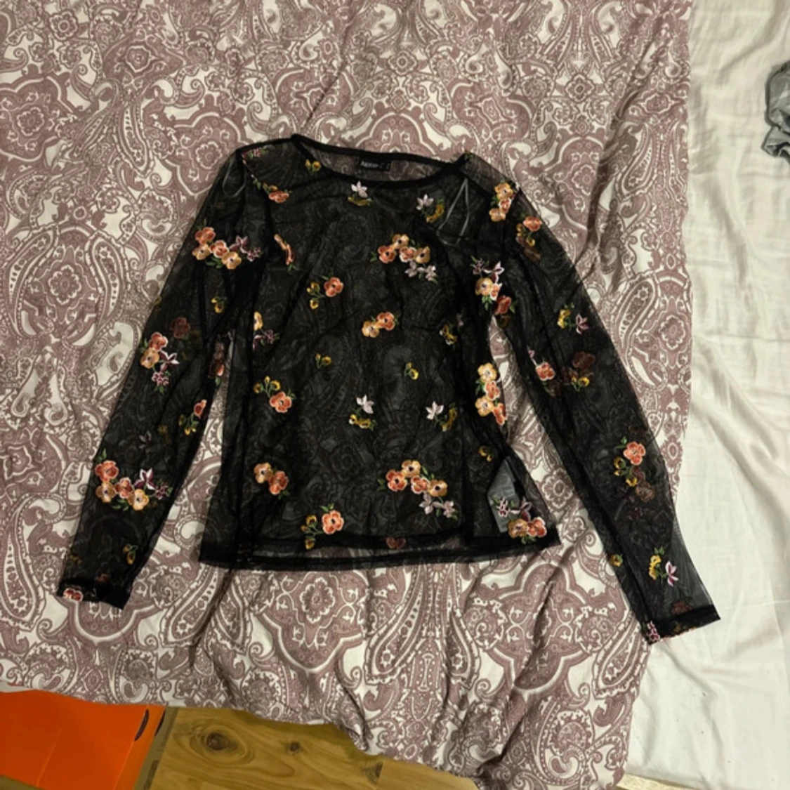 Säljer en superfin svart meshtröja med blommigt broderi i rosa, orange och grönt. Tröjan är långärmad och perfekt för en festlig kväll. Den är i bra skick. Passar perfekt över ett linne eller en bh.