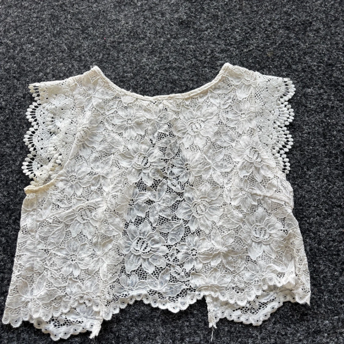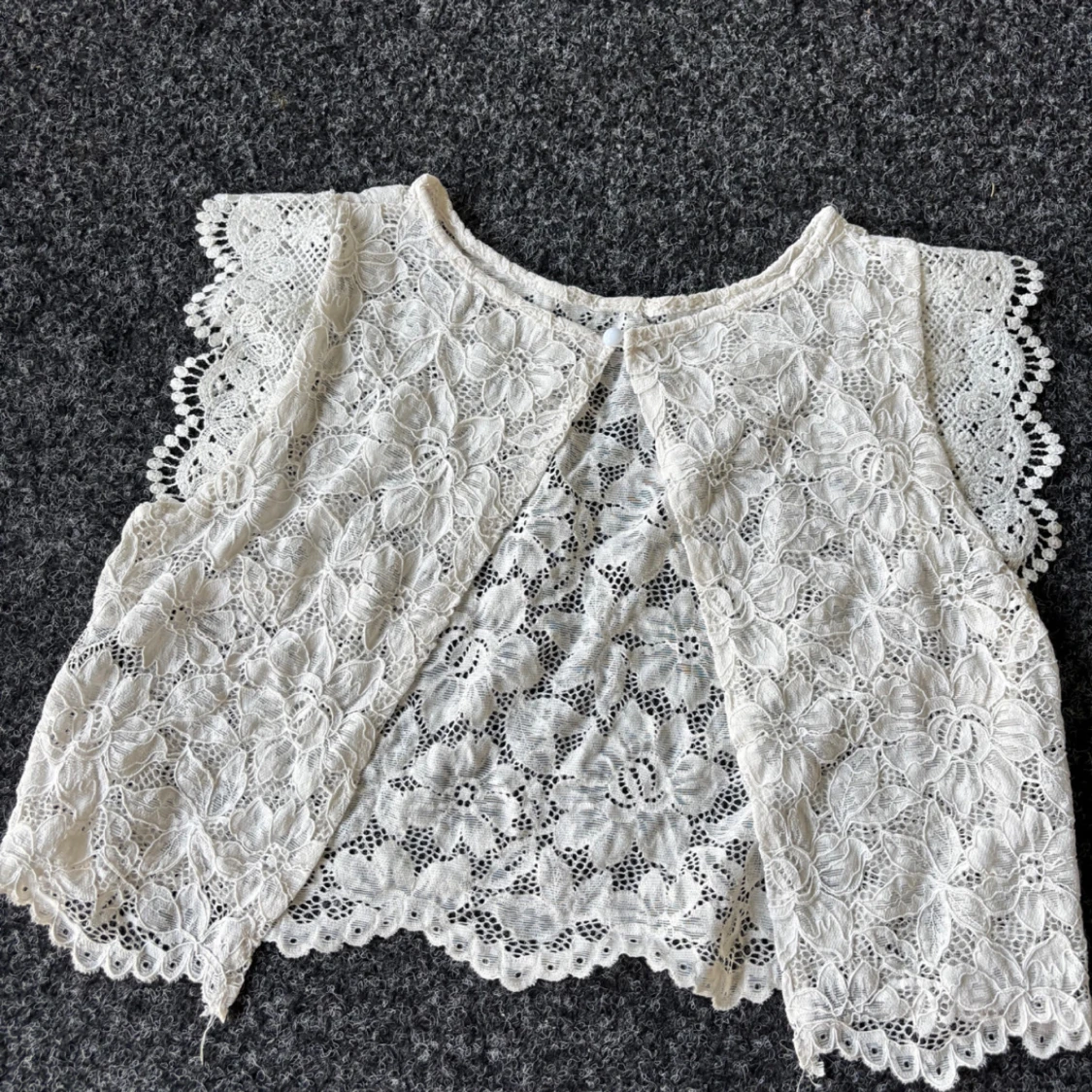 Superfin vit bolerotopp i spets med blommigt mönster och vågiga kanter. Toppen är ärmlös och har öppen rygg, perfekt att slänga över ett linne eller klänning för en extra touch. (Pris kan diskuteras)